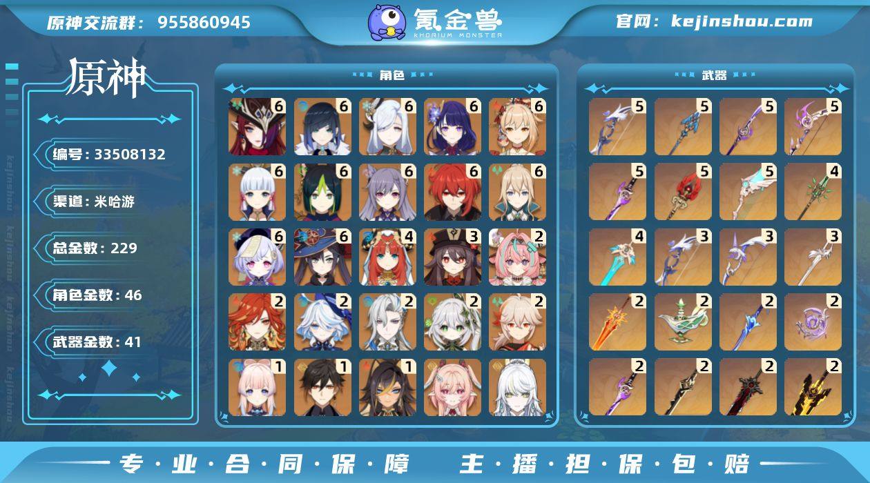 图鉴少的除了爱可菲和法尔伽,其他都是老角色,新体系齐全,金多角色多命座也有,便宜卖了