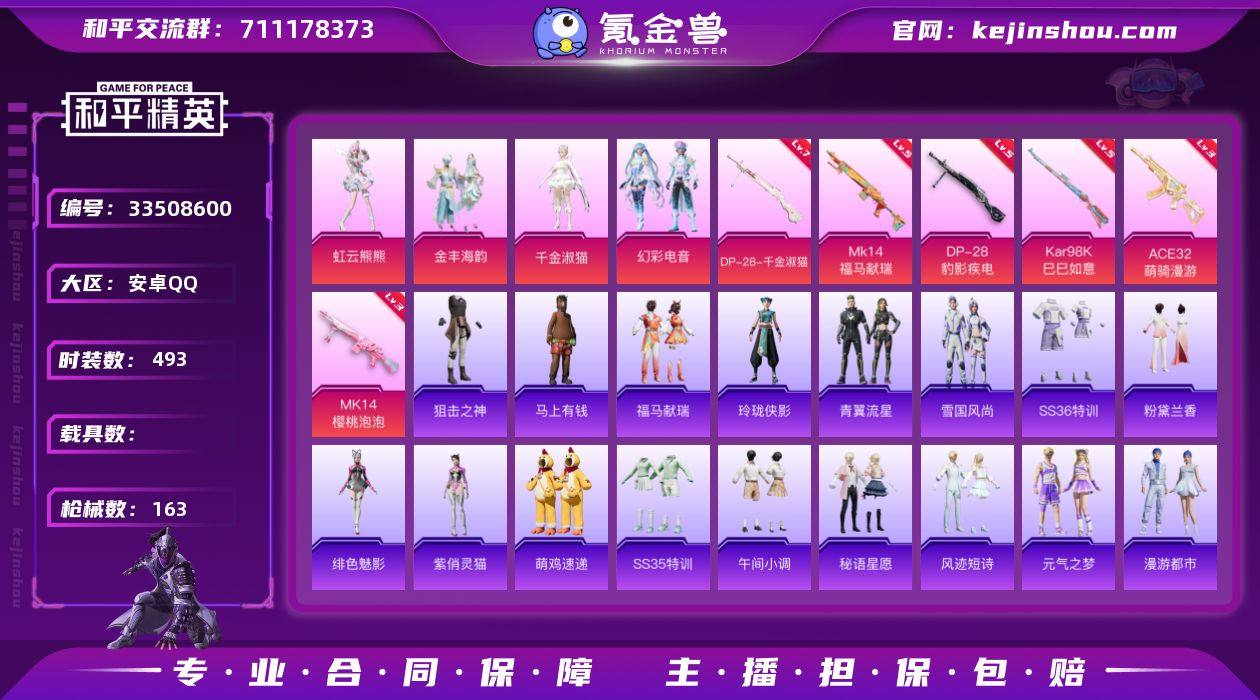 实名: 可修改 时装数: 493 枪械数: 163 热门装扮: 金丰海韵,千金淑猫,幻彩电音,虹云熊熊 稀有枪皮: DP-28-千金淑猫,Kar98K-巳巳如意,MK14-樱桃泡泡,DP-28-豹影疾电,MK14-福马献瑞,ACE32-萌骑漫游 亮点: 【优质装备】:七级DP-28-千金淑猫,虹云熊熊