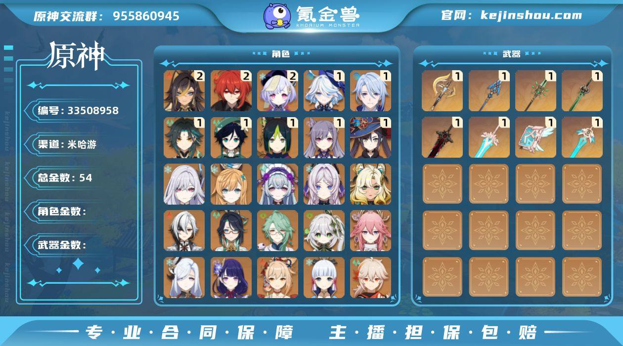 邮箱: 不送邮/死邮 总黄数: 54 冒险等级: 60 2命金色角色: 二命迪卢克,二命七七,二命迪希雅 1命金色角色: 一命温迪,一命刻晴,一命莫娜,一命魈,一命神里绫人,一命提纳里,一命芙宁娜 0命金色角色: 枫原万叶,优菈,神里绫华,宵宫,可莉,达达利亚,钟离,琴,甘雨,雷电将军,申鹤,八重神子,纳西妲,白术,闲云,阿蕾奇诺,希诺宁,茜特菈莉,梦见月瑞希,爱可菲,丝柯克 1精武器: 狼的末路,天空之卷,和璞鸢,天空之傲,天空之刃,磐岩结绿,息灾,裁断