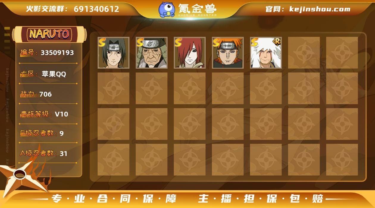 [18796358]V10 9S忍 31A忍 18通灵 706.3W战力 可二次 可修改实名 【S级忍者】自来也 「舞之豪杰」,旗木卡卡西「须佐能乎」,大筒木舍人 「最终章」,自来也 「传说中的三忍」,漩涡鸣人·宇智波佐助,猿飞日斩「秽土转生」,长门「秽土转生」,宇智波鼬 「须佐能乎」,佩恩「天道」 【通灵兽】熊猫