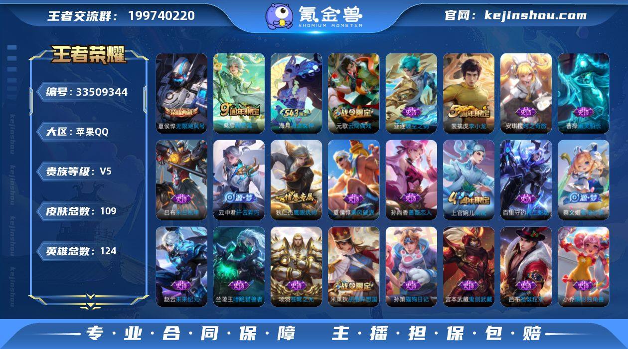 实名: 可修改 性别: 男号 贵族等级: V5 英雄数: 124 皮肤数: 109 荣耀水晶: 无限飓风号 限定皮: 李小龙,梁祝,鸣野蒿 亮点: 【优质装备】:无限飓风号(高达)