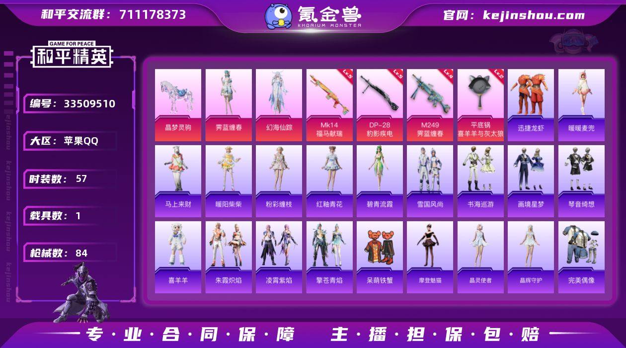 11270精品号 2粉4特1载具 粉马 苹果 手Q-2粉装-4特效枪-1载具-1粉色飞行器-24645热力值-2王牌印记-57套装-84枪皮 【粉色套装】:角色-幻海仙踪,角色-霁蓝缠春 【粉色枪皮等级】:Mk14-福马献瑞(五级),M249-霁蓝缠春(四级),DP-28-豹影疾电(五级),平底锅-喜羊羊与灰太狼(二级) 【粉色载具】:晶梦灵驹 【粉色枪皮】:Mk14-福马献瑞,M249-霁蓝缠春,DP-28-豹影疾电,平底锅-喜羊羊与灰太狼 【粉色飞行器】:炫彩糖果飞行器 【粉色降落伞】:晶梦幻蝶降落伞,喜羊羊与灰太狼降落伞,炫彩糖果降落伞 【稀有套装】:套装-雪国风尚,套装-炫彩糖果,套装-暖暖麦兜,套装-马上来财,套装-迅捷龙虾,角色-摩登魅猫,套装-晶灵使者,套装-晶辉守护,套装-朱霞炽焰,套装-凌霄紫焰,套装-擎苍青焰,玩偶服-喜羊羊,套装-书海巡游,套装-画境星梦,套装-琴音绮想,角色-碧青流霞,套装-粉彩缠枝,套装-雨过天青,套装-红釉青花,角色-暖阳柴柴 【稀有枪皮】:M16A4-千金淑猫,SCAR-L-夜灯,SCAR-L-炫彩节奏,GROZA-晶梦幻蝶,AUG-耀粉歌者,ACE32-画境星梦,ARX-凌霄紫焰,汤姆逊-像素花束,MP5K-画境星梦,JS9-凌霄紫焰,M24-炫彩节奏,Win94-晶梦幻蝶,莫辛纳甘-蜜语绒猫,AMR-喜羊...