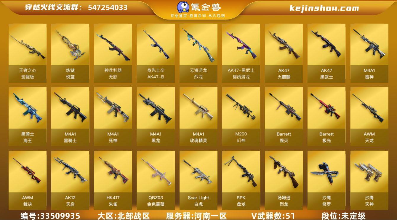 河南一区-55V-5王者武器数-0炫金武器数 【热门武器】:QBZ03-金色蔷薇*2,Scar Light-白虎,HK417-朱雀,M200-幻神,死亡之眼,M4A1-黑骑士,汤姆逊-烈龙*4,RPK-盘龙,加特林-炼狱,沙鹰-修罗*2,荣耀世冠-龙啸,金刚伞 【王者炫金武器】:炼狱-悦蓝,闪光弹-雷霆王者*2 【音效卡】:M4A1-黑骑士音效卡,Barrett-毁灭音效卡,Barrett-极光音效卡 【皮肤】:雷神-能量核心,雷神-耀金皮肤,火麒麟-平天大圣,火麒麟-百城,毁灭-暗月*2,毁灭耀金皮肤,黑骑士-暗月,黑骑士-地狱火,无影-暗月,死神-秘银,烈火-动感闪耀 皮肤,战神-粉色甜心皮肤,AK47-B-常胜将军-刘备,AK47-B-常胜将军-孙权,天龙-能量核心,AWM-天龙-传奇白鲨,极光-能量核心*2,修罗-能量核心,修罗-星空,屠龙-荣耀之锋 【角色】:葵,樱,王者-瞳-闭月羞花,乔伊教练,云海玲珑,暗夜-X,风暴女,嘉年华灵狐,猎狐者-追月,灵狐-花神,灵狐者-X,灵狐者-七夕宝贝,灵狐者-职业经理,龙儿-小淘气,麻雀,潘多拉-X,潘多拉-甜心教官,青霞仙子,斯沃特-X,铁骑荣耀,职业选手 【人偶武器】:AWM-灵狐-15周年嘉年华,迷你裂空之翼,迷你牛魔王,迷你波特博士,夺魂,迷你牛牛,迷你生化手雷,深渊终结者手...