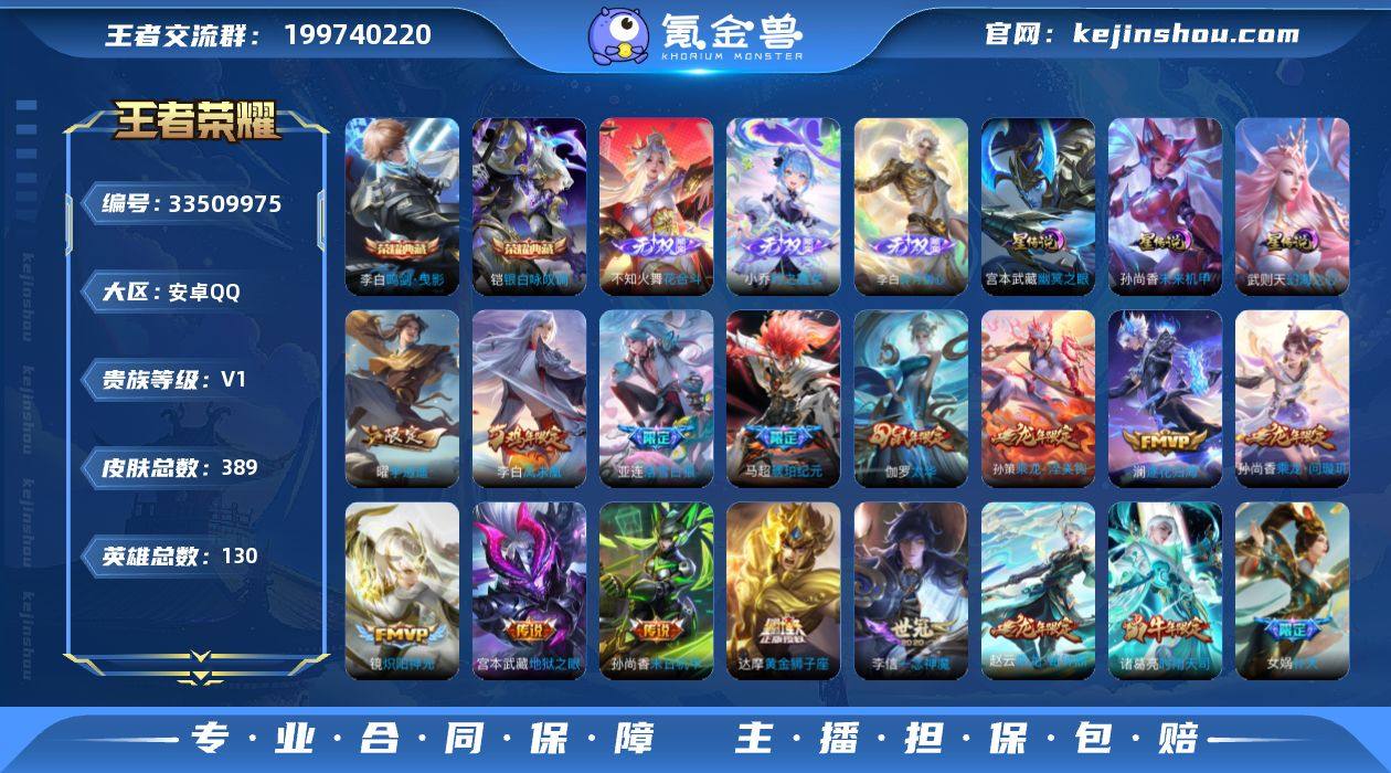 安卓Q-V0-至尊星耀IV段位-130英雄-389皮肤-2典藏皮肤-1典藏英雄-3无双-34传说-113史诗 【英雄全皮】:刘邦全皮,猪八戒全皮,影全皮 【荣耀典藏】:武则天英雄,李白鸣剑曳影,铠银白咏叹调 【无双皮肤】:不知火舞花合斗,小乔时之魔女,李白碎月剑心 【传说皮肤】:海月金乌负日,亚连落雪白狼,吕布曦玄引,貂蝉曦玄引,孙尚香乘龙问璇玑,孙策乘龙淬吴钩,赵云乘龙铭钟鼎,马超琥珀纪元,铠琥珀纪元,澜逐花归海,澜电玩雷克斯,吕布怒海麟威,李白诗剑行,女娲补天,曜李逍遥 ,周瑜音你心动,小乔音你心动,诸葛亮时雨天司,镜炽阳神光,虞姬启明星使,李信一念神魔,刘备时之恋人,伽罗太华,貂蝉猫影幻舞,干将莫邪久胜战神,虞姬云霓雀翎,达摩黄金狮子座,后羿黄金射手座,貂蝉仲夏夜之梦,李白凤求凰,孙尚香末日机甲,宫本武藏地狱之眼,武则天海洋之心,狄仁杰超时空战士 【限定皮肤】:白起狰,狄仁杰阴阳师,虞姬凯尔特女王,廉颇寅虎御盾,赵云皇家上将,赵云引擎之心,墨子神迹守卫,嬴政优雅恋人,嬴政白昼王子,孙尚香蔷薇恋人,鲁班七号狮舞东方,鲁班七号乒乒小将,庄周蜃楼王,庄周高山流水,高渐离死亡摇滚,高渐离玩趣恶龙,阿轲迷踪丽影,钟无艳王者...