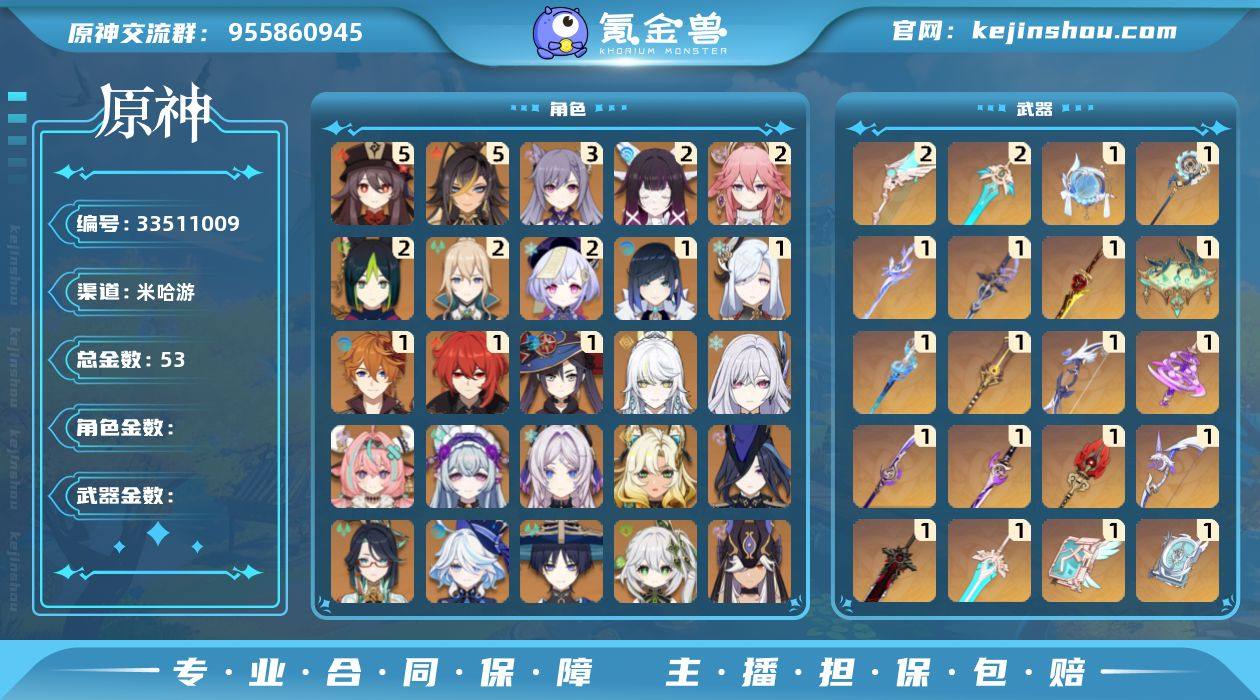 邮箱: 不送邮/死邮 总黄数: 53 冒险等级: 60 5命金色角色: 五命胡桃,五命迪希雅 3命金色角色: 三命刻晴 2命金色角色: 二命七七,二命琴,二命八重神子,二命提纳里,二命哥伦比娅 1命金色角色: 一命迪卢克,一命达达利亚,一命莫娜,一命申鹤,一命夜兰 0命金色角色: 温迪,枫原万叶,神里绫华,宵宫,钟离,甘雨,雷电将军,珊瑚宫心海,赛诺,纳西妲,流浪者,芙宁娜,闲云,克洛琳德,希诺宁,茜特菈莉,梦见月瑞希,瓦雷莎,丝柯克,兹白 2精武器: 天空之翼,天空之刃 1精武器: 狼的末路,雾切之回光,四风原典,天空之卷,阿莫斯之弓,天空之傲,护摩之杖,薙草之稻光,神乐之真意,若水,赤沙之杖,静水流涌之辉,鹤鸣余音,有乐御簾切,赦罪,苍耀,支离轮光,帷间夜曲