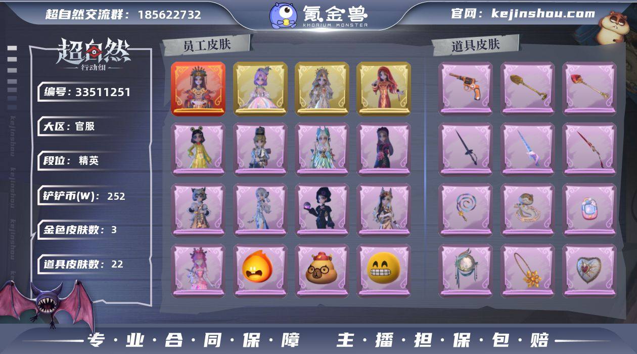 金色皮肤数量: 3 紫色皮肤数量: 9 道具皮肤数量: 22 段位: 精英 员工: 逍遥,薇薇安,巫铃儿,莉莉,阿念,艾伦,小黄,零,爱丽丝,爱德华,兰,小满,临云 外观: 镜生遗梦,遗失的童话,圣光之谕,镜花辞,王子与骑士,瑞羽衔春,丝缕哀歌,霓裳踏雪,素影瑶光,黑月挽歌,白光莹,情公主,嘻嘻头套,烈焰红唇头套,呆滞头套,炙热烧烤,卑微头套,哈士奇头套,滑稽头套,鱼头怪头套,面具马头套,萨卡班甲鱼头套,咬咬鲨头套,小狗蛇点点头套,云梦之星,毛球夹子,天使的呼唤,在逃小新娘,蝶恋花,小鲨包包,未竟乐园,天使消失的年代,钗头凤,呱呱雨衣,小财神豚豚头套,火爆了头套