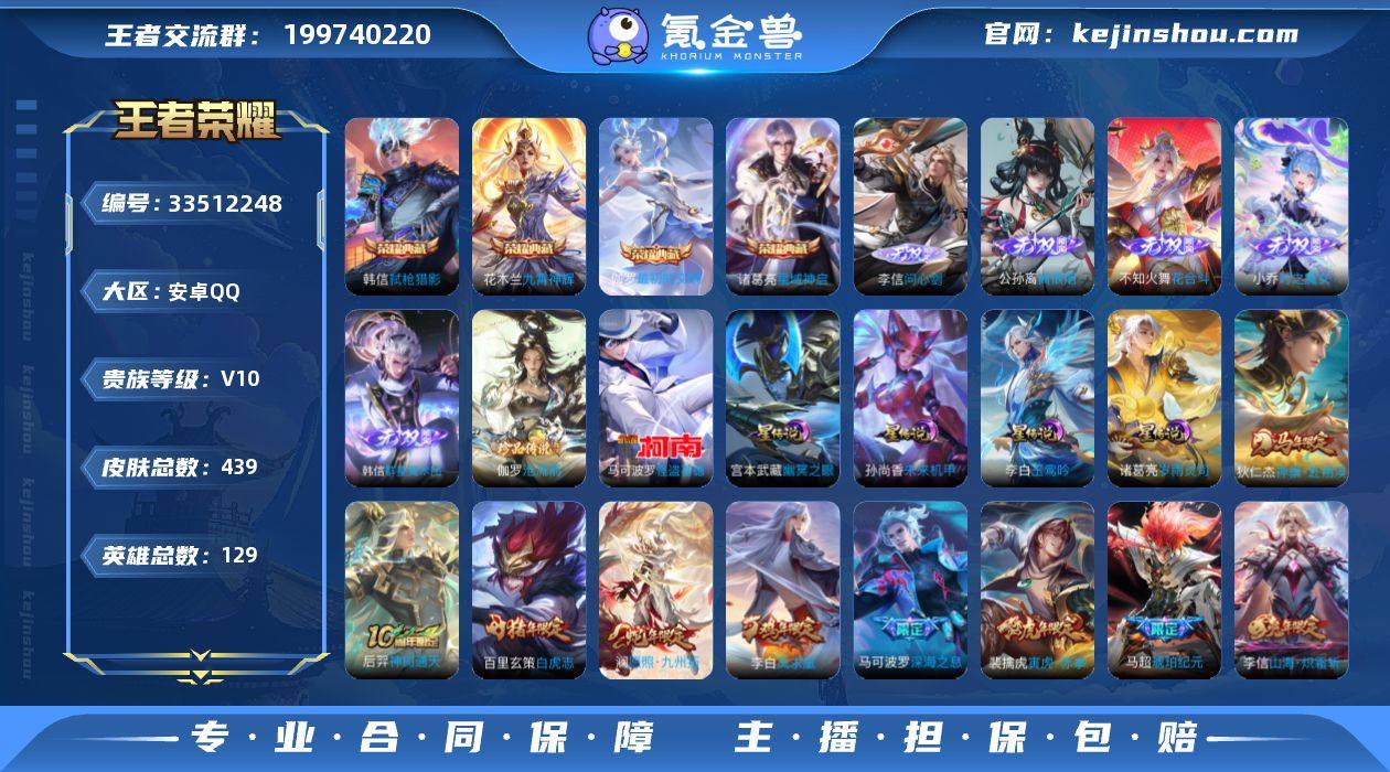 安卓Q-V10-至尊星耀II段位-129英雄-439皮肤-4典藏皮肤-5无双-2珍品传说-57传说-145史诗 【英雄全皮】:孙权全皮,刘备全皮,李信全皮,敖隐全皮,澜全皮,夏洛特全皮,赵怀真全皮,空空儿全皮,影全皮 【荣耀典藏】:诸葛亮星域神启,花木兰九霄神辉,韩信弑枪猎影,伽罗最初的交响 【无双皮肤】:李信问心剑,公孙离离恨烟,不知火舞花合斗,韩信群星魔术团,小乔时之魔女 【珍品传说】:伽罗沧流箭,马可波罗怪盗基德 【传说皮肤】:狄仁杰神骥赴朔漠,后羿神树通天,后羿千劫归真,澜愿照九州拓,云缨幻光神枪,桑启鸣野蒿,铠冥王哈迪斯,墨子黄金天蝎座,典韦战鼓燎原,孙尚香乘龙问璇玑,孙策乘龙淬吴钩,赵云乘龙铭钟鼎,马超琥珀纪元,铠琥珀纪元,澜逐花归海,艾琳觅芳踪,兰陵王影龙天霄,吕布遇见神鼓,马可波罗妄想实况,诸葛亮鹤羽星尊,澜电玩雷克斯,张飞百相守梦,公孙离记忆之芯,夏洛特浮生妄,虞姬无限倾心,伽罗炽翼辉光,李信山海炽霜斩,吕布怒海麟威,李白诗剑行,狄仁杰神器狴犴令,橘右京枫霜尽,马可波罗深海之息,后羿无尽星芒,孙策挚爱之约,裴擒虎寅虎赤拳,孙尚香异界灵契,赵云淬星耀世,西施游龙清影,李元芳飞鸢探春,诸葛亮时雨天司,铠绛...