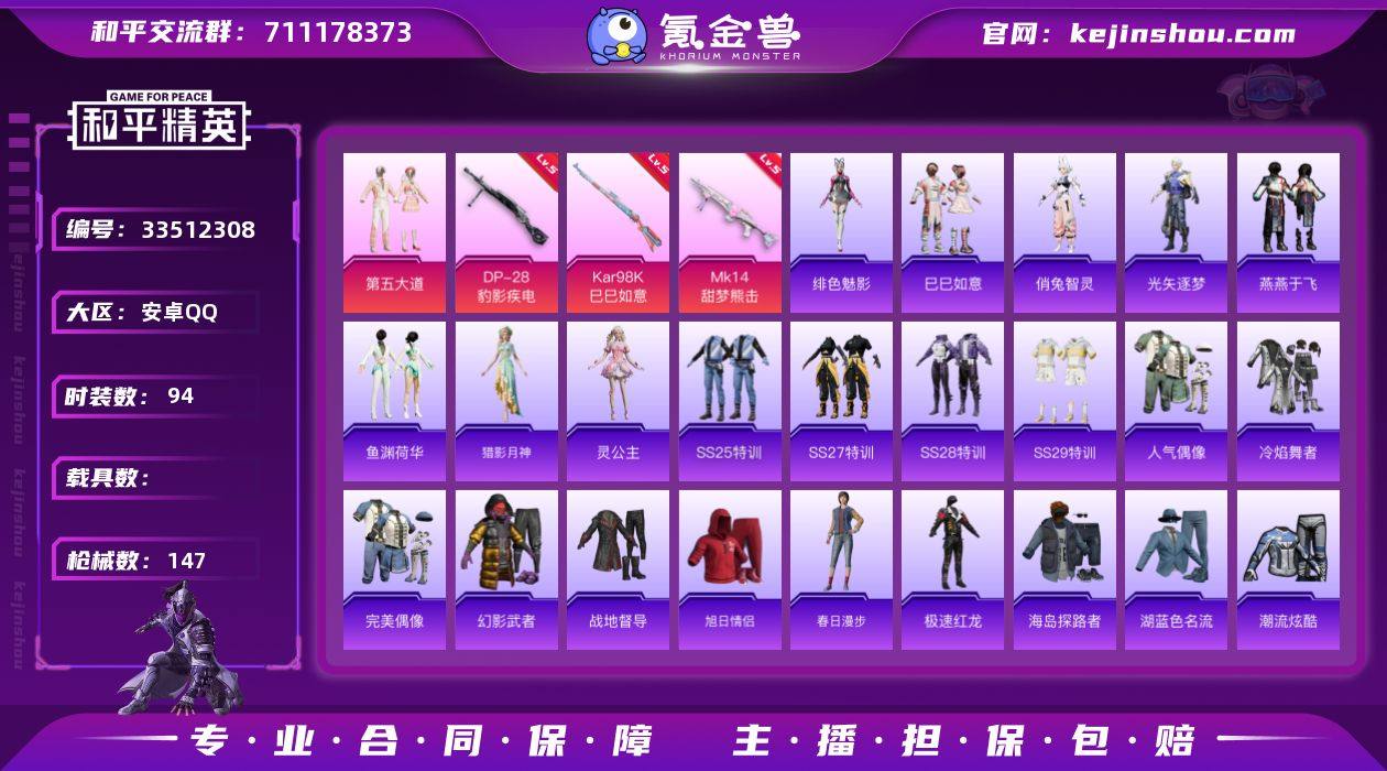LK264155 无二次安卓 手Q-1粉装-7特效枪-0载具-1粉色飞行器-35819热力值-7王牌印记-94套装-147枪皮 【粉色套装】:粉装-第五大道 【粉色枪皮等级】:ACE32-萌骑漫游(四级),AKS-74U-森灵之息(五级),Kar98K-巳巳如意(五级),Mk14-甜梦熊击(五级),Mk14-福马献瑞(五级),AA12-G-萌骑幻想(四级),DP-28-豹影疾电(五级) 【粉色枪皮】:ACE32-萌骑漫游,AKS-74U-森灵之息,Kar98K-巳巳如意,Mk14-甜梦熊击,Mk14-福马献瑞,AA12-G-萌骑幻想,DP-28-豹影疾电 【粉色飞行器】:炫彩糖果飞行器 【粉色降落伞】:星之彼岸降落伞,第五大道降落伞,精灵梦叶罗丽降落伞,千金淑猫降落伞,樱桃泡泡降落伞,幻彩电音降落伞,炫彩糖果降落伞,鸢尾珑雾降落伞 【稀有套装】:套装-巳巳如意,套装-雪国风尚,套装-炫彩糖果,套装-马上有钱,角色-俏兔智灵,角色-光矢逐梦,套装-燕燕于飞,套装-鱼渊荷华,角色-猎影月神,角色-灵公主,角色-绯色魅影,角色-霜刃之御,套装-雨过天青,套装-红釉青花 【稀有枪皮】:AUG-冰晶雪宝,AKM-破晓战魂,AKM-龙的传人,M16A4-红色方程式,M16A4-蓝色火焰,SCAR-L-夜灯,SCAR-L-玉兔迎春,SCAR-L-红色方程式,M416-红色方程式,M416-蓝色火焰,AUG-天降...
