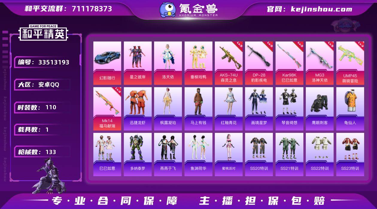 安卓 手Q-3粉装-6特效枪-1载具-0粉色飞行器-36992热力值-3王牌印记-110套装-133枪皮 【热门品类】:套装-龟仙人 【粉色套装】:粉装-星之彼岸,角色-洛天依,粉装-垂柳戏鸭 【粉色枪皮等级】:UMP45-萌骑冒险(三级),AKS-74U-森灵之息(五级),Kar98K-巳巳如意(五级),Mk14-福马献瑞(三级),DP-28-豹影疾电(五级),MG3-洛神天依(五级) 【粉色载具】:幻影随行 【粉色枪皮】:UMP45-萌骑冒险,AKS-74U-森灵之息,Kar98K-巳巳如意,Mk14-福马献瑞,DP-28-豹影疾电,MG3-洛神天依 【粉色降落伞】:星之彼岸降落伞,环太平洋降落伞,海螺星光降落伞,天星战神降落伞,星梦奇缘降落伞 【稀有套装】:套装-龟仙人,套装-巳巳如意,套装-马上有钱,套装-迅捷龙虾,角色-多纳泰罗,套装-燕燕于飞,套装-鱼渊荷华,角色-蜜桃派对,套装-画境星梦,套装-琴音绮想,套装-雨过天青,套装-红釉青花,角色-枫露凝珀 【稀有枪皮】:AKM-彩虹符号,AKM-星之彼岸,AKM-破晓战魂,AKM-龙的传人,M16A4-幻世战舞者,M16A4-蓝色火焰,SCAR-L-夜灯,SCAR-L-玉兔迎春,SCAR-L-红色方程式,M416-糯团青竹,M416-红色方程式,M416-绯红前夜,M416-蓝色火焰,GROZA-彩虹符号,GROZA-田园牧歌,AUG-海螺星...