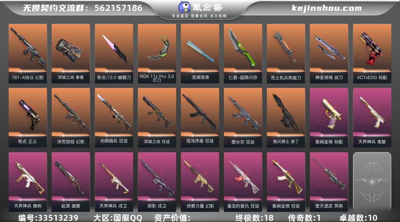 w5333 【连体lol德玛西亚754皮 4终极 21神话 60传说 13臻彩id:039393945】侦查幻影 盖亚狂徒 流脓幻影 威龙之刃 黑波之刃 双城套 金箍棒 天界戍卫 紫金狂徒 堕天狂徒 天界鬼魅 天界蜂刺 毁灭奥丁 起源雄鹿 奇点正义 奇点蝴蝶刀 掠夺戍卫 紫金标配 781幻影 显卡爪刀 混沌狂徒 塑水狂徒 澄湖潋滟 哨兵狂徒 vctedg标配库存: 48970剩余VP:190剩余R点:50 段位:未定级(青铜)历史最高:白银