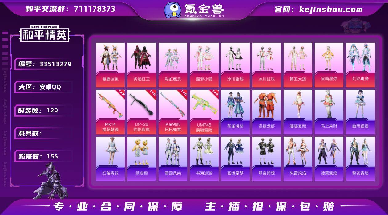11255精品号 9粉4特 童趣迷兔 甜梦小狐 红熊茄茄 糯粉咩咩 安卓 手Q-9粉装-4特效枪-0载具-3粉色飞行器-45176热力值-7王牌印记-120套装-155枪皮 【热门品类】:粉装-童趣迷兔,套装-浪漫天命,套装-糯粉咩咩,套装-红熊茄茄 【粉色套装】:粉装-童趣迷兔,粉装-炙焰红王,粉装-彩虹鹿灵,粉装-甜梦小狐,粉装-冰川幽秘,粉装-冰川红玫,粉装-第五大道,角色-呆萌星弥,粉装-幻彩电音 【粉色枪皮等级】:UMP45-萌骑冒险(四级),Kar98K-巳巳如意(五级),Mk14-福马献瑞(五级),DP-28-豹影疾电(五级) 【粉色枪皮】:UMP45-萌骑冒险,Kar98K-巳巳如意,Mk14-福马献瑞,DP-28-豹影疾电 【粉色飞行器】:炫彩糖果飞行器,冰川粉黛飞行器,极意拳锋飞行器 【粉色降落伞】:童趣迷兔降落伞,垂柳戏鸭降落伞,冰川粉黛降落伞,第五大道降落伞,金丰海韵降落伞,时光之吻降落伞,奇迹舞步降落伞,炫彩糖果降落伞,鸢尾珑雾降落伞,百变纱华降落伞 【稀有套装】:套装-熊抱抱,套装-摩登天骄,套装-绒宝小鹅,套装-巳巳如意,套装-雪国风尚,套装-炫彩糖果,套装-顽皮橙,套装-暖暖麦兜,套装-马上来财,套装-迅捷龙虾,套装-雏菊兔兔,套装-萝兰蝴蝶,套装-小熊娃娃,套装-糖糖葫芦,套...