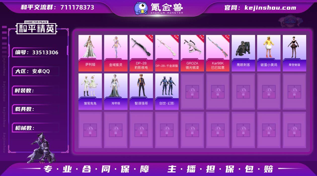 DSH2428【2粉装-6特效枪蓝螳螂 粉螳螂】安卓手Q-2粉装-6特效枪-63套装-102枪皮-2王牌印记-卓越王牌10星-28158热力值【2粉装】角色-金域紫灵,角色-萨利娅【6特效枪】DP-28-豹影疾电[5级],GROZA-镜光银凌[5级],M762-青锋波束[5级],Kar98K-巳巳如意[5级],DP-28-千金淑猫[5级],Mk14-福马献瑞[4级]【1稀有】M24-奇异狩猎者【2飞行器】空岛之星尾迹,顶峰精英尾迹【156其它衣服和枪皮】创世·幻影,青团波波,灼焰舞者,巳巳如意,薄荷星砂,糖糖葫芦,SS30特训,角色-海琴烟,黄色运动,香桃花海,纯真浪花,破蛋小黄鸡,SS31特训,长空猛禽,街头风暴,SS29特训,冷焰舞者,智谋强哥,小熊娃娃,龙魂突击队,SS28特训,SS35特训,深蓝色名流,角色-摩登魅猫,萝兰蝴蝶,燕燕于飞,冰河战士,竞技名士,黑色伏地魔,特殊使命,棉花软糖,SS32特训,SS37特训,春光漫游,SS27特训,SS34特训,快闪甜心,雏菊兔兔,角色-Mark.06,狙击之神,空岛之星,蓝调潮影,蝶变,SS33特训,元气之梦,白色伏地魔,摩登天骄,星途旅人,贵族骑装,热情海星,鹰眼刺客,黄色伏地魔,老实芭蕉,完美偶像,鱼渊荷华,战术大师,海盐绵绵冰,角色-紫俏灵猫,军械专家,铁血战翼,角色-8号机,蜜獾-白蛇盈舞,AMR-鸡智如我,蝎式手枪-燕燕于飞,破片手榴弹-星途旅人,S12K-...