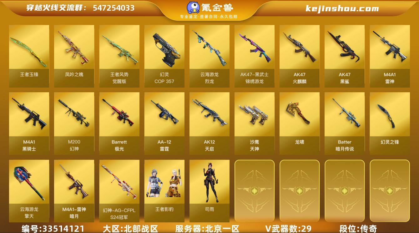【ky6936】北京一区-35V-3王者武器数-0炫金武器数 【热门武器】:M200-幻神,凤吟之魄,QBZ03-街机,牛牛-AK47,M4A1-黑骑士,COP 357-幻灵 【王者炫金武器】:凤吟之魄,王者玉锋 【音效卡】:屠龙-电竞之星-竞星跃动音效卡,Barrett-极光音效卡,HK417-朱雀-电竞之星-竞星跃动音效卡 【皮肤】:幻神-冠军之幻,幻神-AG-CFPL S24冠军 皮肤,幻神-电竞之星 皮肤,雷神-暗月,雷神-源计划2.0专属 皮肤,龙啸-巅峰荣耀 皮肤 【角色】:司雨,不败狙神,王者影豹,蛇隐宗,乔伊教练,云海玲珑,幻面灵狐,斗烈龙骑,电竞少女,猎狐者-追月,灵狐者-X,灵狐者-七夕宝贝,流浪蔷薇,龙儿-小淘气,曼陀罗-X,潘多拉-甜心教官,蛇姬,兔囡囡,新娜塔莎,影武者-X 【人偶武器】:Scar Light-马枪,牛牛-AK47,迷你牛牛,迷你生化手雷,深渊终结者手雷,AK12-烈火-灵狐者,灵狐娃娃手雷 【暴走生化】:双面神-竞魂*3,双面神 【挑战大师】:冰龙粉碎者-白马银枪*2,机甲撕裂者III,KAC-圣炎切割者III 【英雄级武器】:AK47-火麒麟,M4A1-雷神,M4A1-黑骑士,AK12-天启,AK47-黑鲨,黑武士-锦绣游龙,王者风势-觉醒版,HK417-朱雀-电竞之星,Barrett-极光,M200-幻神,Barrett-暗月传说...