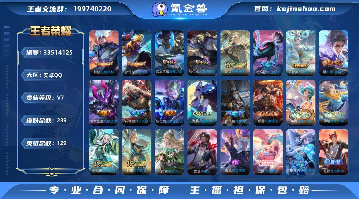 王者20988,安卓Q-V7-永恒钻石II段位-129英雄-239皮肤-2典藏皮肤-7传说-70史诗 【英雄全皮】:孙权全皮,影全皮 【荣耀典藏】:孙悟空全息碎影,韩信弑枪猎影 【传说皮肤】:后羿神树通天,司马懿九山相柳,公孙离云诺千山,孙悟空齐天大圣,曜山海苍雷引,宫本武藏地狱之眼,狄仁杰超时空战士 【限定皮肤】:狄仁杰阴阳师,赵云皇家上将,赵云龙胆,墨子神迹守卫,孙尚香蔷薇恋人,庄周高山流水,高渐离玩趣恶龙,钟无艳王者之锤,白起夜都怪侠,芈月幻夜卜梦,吕布猎兽之王,元歌无心,典韦蓝屏警告,狄仁杰魔术师,狄仁杰万华元夜,达摩沙漠行僧,项羽海滩派对,老夫子航海奇遇记,程咬金演武夺筹,兰陵王金庭之子,孙悟空齐天大圣,后羿圣弓游侠,李元芳云中旅人,钟馗驱傩正仪,干将莫邪真爱魔法,雅典娜黎明之约,鬼谷子原初探秘者,鬼谷子五谷丰年,黄忠火炮绅士,铠青龙志,苏烈千军破阵,梦奇顽趣,沈梦溪大漠名商,明世隐吟游魔法,裴擒虎李小龙,裴擒虎擒涛扼浪,伽罗天狼溯光者,猪八戒猪悟能,嫦娥拒霜思,曜山海苍雷引,鲁班大师探海日志,桑启海盐诗旅,阿古朵江河有灵,张良古海寻踪,蒙恬荣光圣徽,鬼谷子天穹祈灯,沈梦溪龙舞盛年 【年限皮肤】:铠青龙志,...