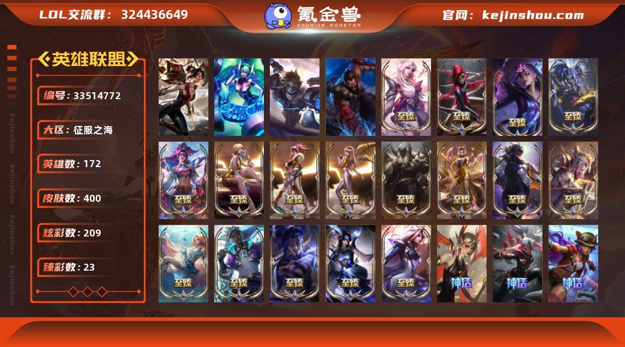 【LSA1494】172英雄/400皮肤/3终极/29神话/76限定/23臻彩/209炫彩/43传说/32史诗/未定级账号等级:355/殿堂传奇 卡莎/殿堂传奇 乐芙兰/十五周年纪念 希维尔/殿堂传奇 薇恩/灰烬骑士 潘森/灰烬骑士 莫德凯撒/水晶巫灵 泽拉斯/灰烬骑士 派克/至臻 绝息圣堂 厄运小姐/至臻蒙面女郎莫甘娜/至臻 K/DA 伊芙琳/至臻 黑色玫瑰假面舞会 卡特琳娜/至臻 暗裔英雄 嘉文四世/至臻 K/DA 阿卡丽/至臻 幻灵狮心 蕾欧娜/至臻 灵魂莲华 拉克丝/至臻 K/DA 阿狸/至臻 青花瓷 丽桑卓/至臻 女帝 黛安娜/至臻 暗星女王 黛安娜/至臻永恒星灵佐伊/至臻 K/DA 卡莎/至臻 海之歌 萨勒芬妮/至臻 魔域梦魇 泽丽/至臻 真实伤害 赛娜/至臻 灵魂莲华 劫/至臻 星之守护者 艾克/至臻 腥红之月 亚托克斯/至臻 莲华温泉 厄斐琉斯/至臻 至高天 奎桑提/天龙之子 卡莎 飞龙乘云/闭月之颜 貂蝉 炫金莲华/神龙尊者 圣龙李青 龙腾云起/花仙子 拉克丝 纹白/弹幕天使 卡莎 炽天使·勇敢/玉剑传说 无影 竞星/西部魔影 卢锡安 贝利尔之怠/星之守护者 奥莉安娜 未来之光/玉剑传说 无劫 胭脂/幻灵战斗猫 金克丝 梦幻强袭/星之守护者 金克丝 黑洞/幻灵战斗蝠 薇恩 梦幻强袭/泳池派对 奥莉安娜 优雅珠光鲸/星之吞噬者 莫甘娜 热情之...