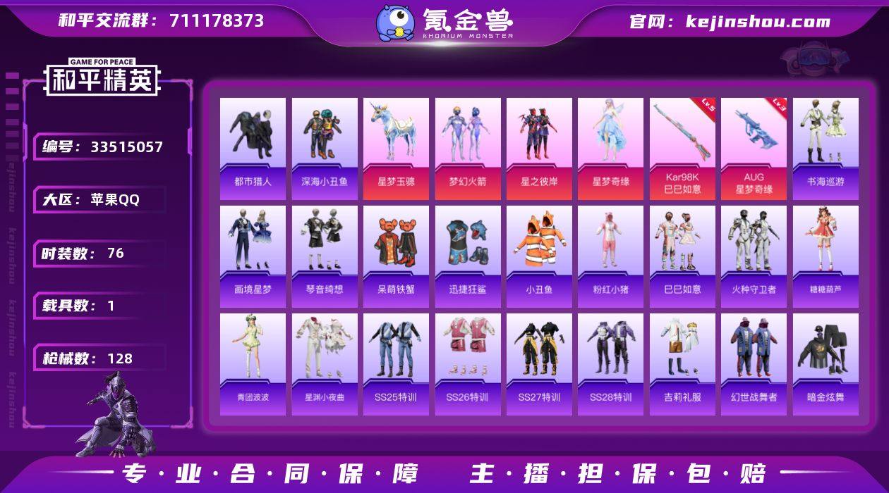 苹果 手Q-3粉装-7特效枪-1载具-1粉色飞行器-33759热力值-3王牌印记-76套装-128枪皮 【热门品类】:粉装-梦幻火箭,套装-都市猎人,套装-深海小丑鱼,套装-小丑鱼,套装-粉红小猪 【粉色套装】:粉装-梦幻火箭,粉装-星之彼岸,角色-星梦奇缘 【粉色枪皮等级】:AUG-星梦奇缘(三级),ACE32-萌骑漫游(五级),UMP45-萌骑冒险(三级),Kar98K-巳巳如意(五级),Mk14-福马献瑞(五级),AA12-G-萌骑幻想(二级),PKM-萌骑夺宝(二级) 【粉色载具】:星梦玉骢 【粉色枪皮】:AUG-星梦奇缘,ACE32-萌骑漫游,UMP45-萌骑冒险,Kar98K-巳巳如意,Mk14-福马献瑞,AA12-G-萌骑幻想,PKM-萌骑夺宝 【粉色飞行器】:星之彼岸飞行器 【粉色降落伞】:绝对恒星降落伞,梦幻火箭降落伞,星之彼岸降落伞,星梦奇缘降落伞,异瞳寒姬降落伞 【稀有套装】:套装-巳巳如意,套装-雪国风尚,套装-马上有钱,套装-迅捷龙虾,套装-火种守卫者,套装-糖糖葫芦,套装-青团波波,套装-星渊小夜曲,套装-书海巡游,套装-画境星梦,套装-琴音绮想,角色-月烬之祷,套装-雨过天青,套装-红釉青花,套装-燕雀桃枝 【稀有枪皮】:AKM-星之彼岸,AKM-破晓战魂,AKM-缤纷海域,AKM-龙的传人,M416-糯团青竹,M416-红色...