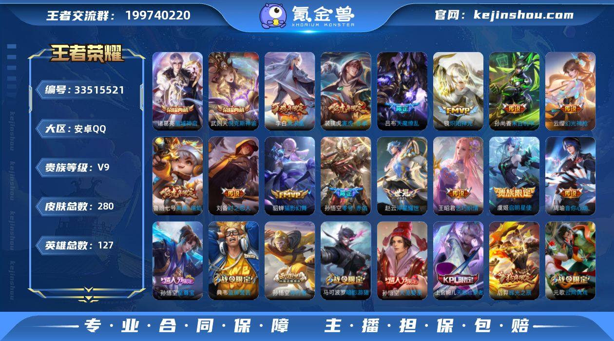 安卓QQ v9 280皮 天魔缭乱 老虎年限 2典藏14传说3星传说’ 安卓Q-V9-荣耀黄金III段位-125英雄-280皮肤-2典藏皮肤-1典藏英雄-14传说-73史诗 【荣耀典藏】:武则天英雄,武则天倪克斯神谕,诸葛亮星域神启 【传说皮肤】:云缨幻光神枪,裴擒虎寅虎赤拳,鲁班七号寅虎瑞焰,赵云淬星耀世,王昭君乞巧织情,周瑜音你心动,镜炽阳神光,虞姬启明星使,孙悟空零号赤焰,刘备时之恋人,貂蝉猫影幻舞,李白凤求凰,孙尚香末日机甲,吕布天魔缭乱 【限定皮肤】:白起狰,狄仁杰阴阳师,虞姬凯尔特女王,廉颇寅虎御盾,赵云皇家上将,赵云龙胆,墨子神迹守卫,嬴政白昼王子,鲁班七号狮舞东方,鲁班七号寅虎瑞焰,庄周蜃楼王,高渐离死亡摇滚,阿轲迷踪丽影,孙膑妖精王,孙膑寅虎展翼,扁鹊炼金王,芈月重明,吕布天魔缭乱,吕布猎兽之王,吕布御风骁将,周瑜赤莲之焰,元歌云间偶戏,夏侯惇朔风刀,甄姬幽恒,甄姬游园惊梦,曹操烛龙,典韦穷奇,典韦蓝屏警告,马可波罗暗影游猎,狄仁杰魔术师,狄仁杰万华元夜,达摩星际陆战队,达摩沙漠行僧,项羽海滩派对,项羽霸王别姬,老夫子醍醐杖,老夫子航海奇遇记,程咬金演武夺筹,刘邦夺宝奇兵,韩信飞衡,兰陵王驯魔猎人,兰陵王金庭之子...