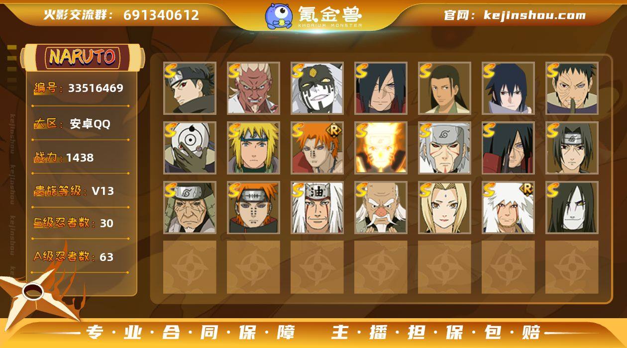 [18802844]V13 30S忍 63A忍 22通灵 1438.2W战力 可二次 可修改实名 【S级忍者】宇智波止水「须佐能乎」,艾「忍界大战」,大筒木桃式,宇智波斑「秽土转生·解」,千手柱间·木叶创立,宇智波佐助「永恒万花筒」,大筒木金式「博人传」,漩涡鸣人 「九喇嘛连结」,大野木 「忍界大战」,宇智波带土 「忍界大战」,自来也 「舞之豪杰」,旗木卡卡西「须佐能乎」,大筒木舍人 「最终章」,自来也 「传说中的三忍」,漩涡鸣人 「暴怒·第六尾」,宇智波斑「五影会谈」,漩涡鸣人·宇智波佐助,宇智波带土「十尾人柱力」,宇智波斑「神驹佑将」,佩恩·天道「超」,宇智波斑「秽土转生」,宇智波斑「白面具」,千手扉间「秽土转生」,猿飞日斩「秽土转生」,宇智波鼬 「须佐能乎」,佩恩「天道」,波风水门,大蛇丸,自来也,纲手