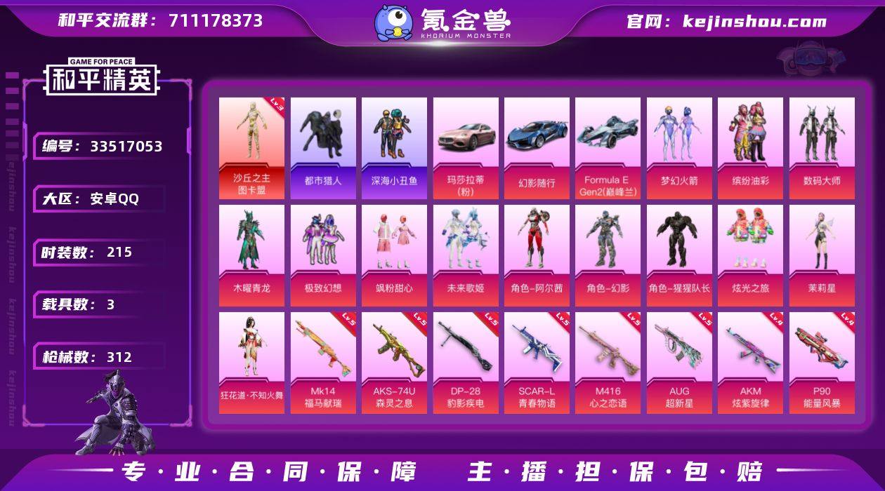 安卓 手Q-1神装-13粉装-19特效枪-3载具-4粉色飞行器-108849热力值-17王牌印记-215套装-312枪皮 【红色神装等级】:沙丘之主-图卡盟(三级) 【红色角色神装】:沙丘之主-图卡盟 【热门品类】:粉装-梦幻火箭,粉装-缤纷油彩,套装-都市猎人,套装-深海小丑鱼,套装-小丑鱼,角色-2P战斗服款,套装-龟仙人,套装-潮萌小黄鸭,套装-浪漫波比,套装-粉红小猪 【粉色套装】:粉装-数码大师,粉装-木曜青龙,粉装-梦幻火箭,粉装-缤纷油彩,粉装-极致幻想,粉装-飒粉甜心,粉装-未来歌姬,角色-阿尔茜,角色-幻影,角色-猩猩队长,粉装-炫光之旅,角色-茉莉星,角色-狂花道·不知火舞 【粉色枪皮等级】:AKM-炫紫旋律(四级),SCAR-L-青春物语(五级),M416-心之恋语(五级),AUG-超新星(五级),AUG-花中眠(二级),ACE32-萌骑漫游(二级),UMP45-萌骑冒险(一级),AKS-74U-森灵之息(五级),P90-能量风暴(四级),P90-沙丘之主(三级),Kar98K-未来歌姬(四级),Kar98K-巳巳如意(四级),M24-莲影清波(四级),Mk14-福马献瑞(五级),AMR-炫光之旅(四级),AA12-G-萌骑幻想(二级),DP-28-豹影疾电(五级),MG3-酷泡奶龙(四级),燃烧瓶-天降桃花(四级) 【粉色载具】:玛莎拉蒂Ghibli(粉),幻影随行...
