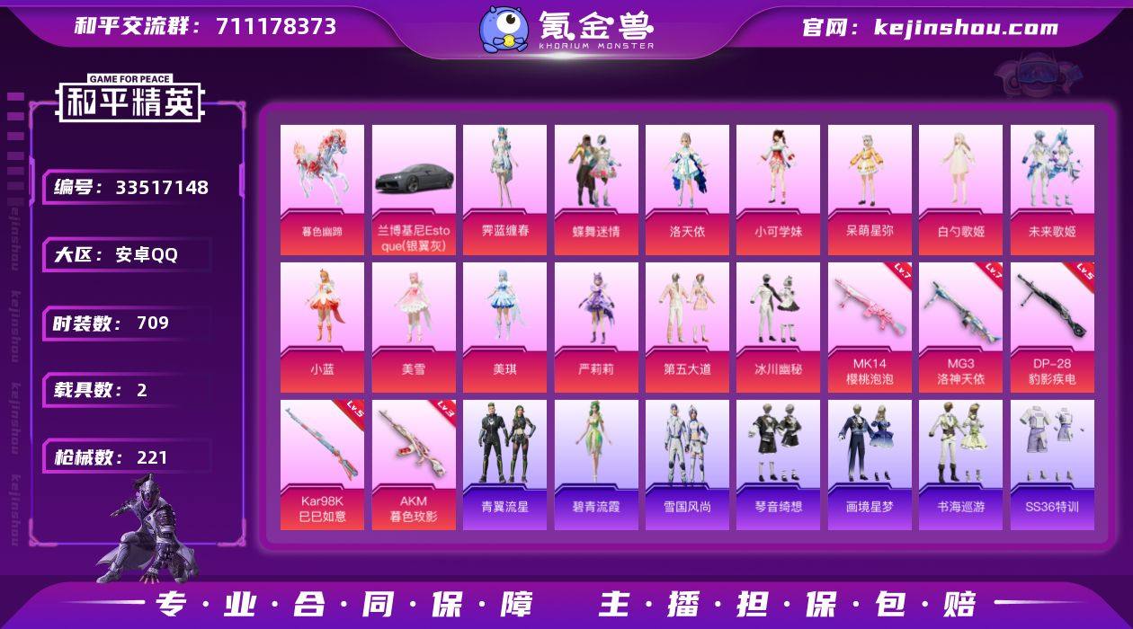 实名: 可修改 时装数: 709 载具数: 2 枪械数: 221 战备数: 2 热门装扮: 蝶舞迷情,浪漫波比,爱崽白熊,恒星战甲,洛天依,冰川幽秘,潮萌小黄鸭,大橘为重,激萌罗小黑,软萌银虎,第五大道,小可学妹,白勺歌姬,呆萌星弥,未来歌姬,暗夜魅影,严莉莉,美雪,美琪,小蓝,霁蓝缠春 载具: 兰博基尼Estoque(银翼灰),暮色幽蹄 稀有枪皮: MG3洛神天依,Kar98K-巳巳如意,MK14-樱桃泡泡,DP-28-豹影疾电,AKM-暮色玫影