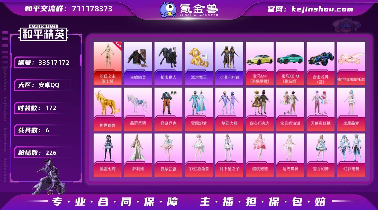 11314 极品男神号 粉丝logo 1红17粉13特6载具 4级图卡盟 怪诞巧克 雪国 赤蝎 金鞋 黑丝 都市猎人 甜心巧克力 新101 红熊茄茄 糯粉咩咩 暗影哥特 满级樱桃泡泡 3级霜月狼主 宝马X6 宝马M4 晶梦灵驹 安卓 手Q-1神装-17粉装-13特效枪-6载具-10粉色飞行器-84813热力值-12王牌印记-172套装-226枪皮 【红色神装等级】:沙丘之主-图卡盟(四级) 【红色角色神装】:沙丘之主-图卡盟 【热门品类】:粉装-怪诞乔克,粉装-雪国幻梦,粉装-梦幻火箭,套装-浪漫天命,套装-赤蝎幽灵,套装-都市猎人,套装-派对舞王,套装-小丑鱼,套装-沙漠守护者,套装-AG战队服,套装-龟仙人,套装-暗影哥特,套装-浪漫波比,套装-糯粉咩咩,套装-红熊茄茄 【粉色套装】:粉装-怪诞乔克,粉装-甜心巧克力,粉装-宝贝奶油派,粉装-天使彩虹糖,粉装-雪国幻梦,粉装-梦幻火箭,角色-鸢尾晶梦,角色-脆鲨七海,角色-萨利娅,角色-晶梦幻蝶,角色-彩虹独角兽,角色-月下星之子,角色-樱桃泡泡,角色-翎光蝶翼,粉装-雪月幻音,粉装-幻彩电音,角色-狂魅哈莉 【粉色枪皮等级】:UMP45-霜月狼主(三级),SCAR-L-金蛇镇世(三级),M416-女娲灵识(三级),AUG-暖羊咩咩(五级),UMP45-萌骑冒险(一级),Kar98K-巳巳...