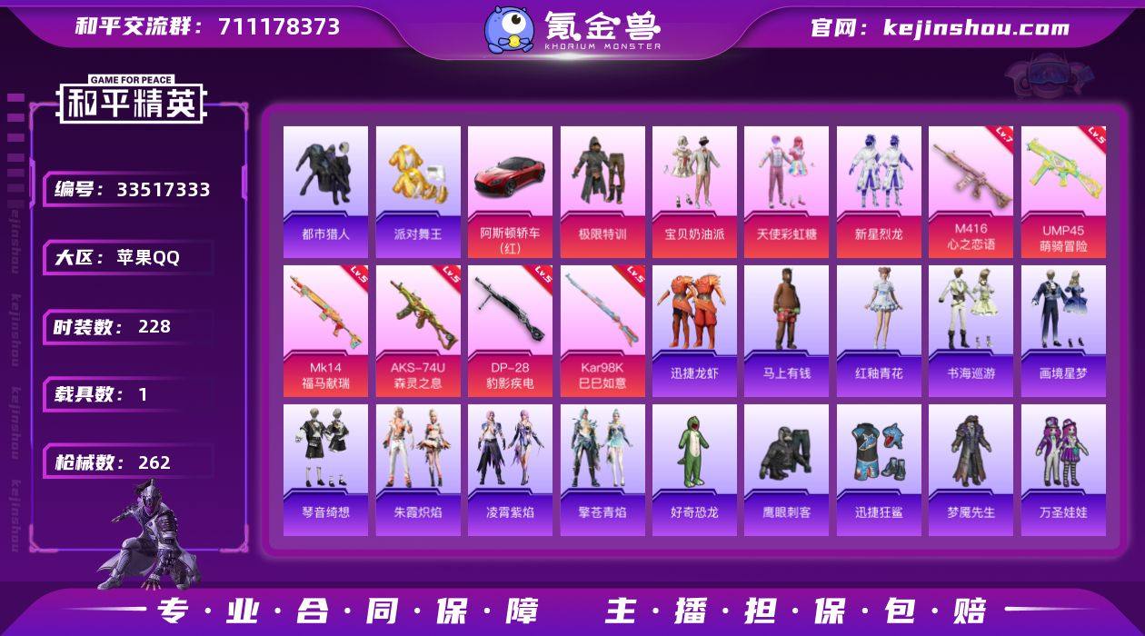 J3321 精品 4粉 6特 1载具 派对舞王 都市猎人 极限特训 新星烈龙 天使彩虹糖 宝宝奶油派 满级心之恋语 苹果 手Q-4粉装-6特效枪-1载具-3粉色飞行器-74054热力值-20王牌印记-228套装-262枪皮 【热门品类】:套装-都市猎人,套装-派对舞王,套装-龟仙人 【粉色套装】:粉装-极限特训,粉装-宝贝奶油派,粉装-天使彩虹糖,粉装-新星烈龙 【粉色枪皮等级】:M416-心之恋语(七级),UMP45-萌骑冒险(五级),AKS-74U-森灵之息(五级),Kar98K-巳巳如意(五级),Mk14-福马献瑞(五级),DP-28-豹影疾电(五级) 【粉色载具】:阿斯顿马丁DBS(红) 【粉色枪皮】:M416-心之恋语,UMP45-萌骑冒险,AKS-74U-森灵之息,Kar98K-巳巳如意,Mk14-福马献瑞,DP-28-豹影疾电 【粉色飞行器】:炫彩糖果飞行器,神秘黑猫飞行器,月下星之子飞行器 【粉色降落伞】:甜心宝贝降落伞,至尊龙雀降落伞,天启纪元降落伞,PEL轰鸣竞梦者降落伞,神秘黑猫降落伞,翎光蝶翼降落伞,星穹咏叹调降落伞,异瞳寒姬降落伞,炫彩糖果降落伞 【稀有套装】:套装-龟仙人,套装-巳巳如意,套装-炫彩糖果,套装-马上有钱,套装-迅捷龙虾,套装-燕燕于飞,套装-鱼渊荷华,角色-糖霜甜心,套装-粉恋花,套装-紫幽梦,套装-蓝...