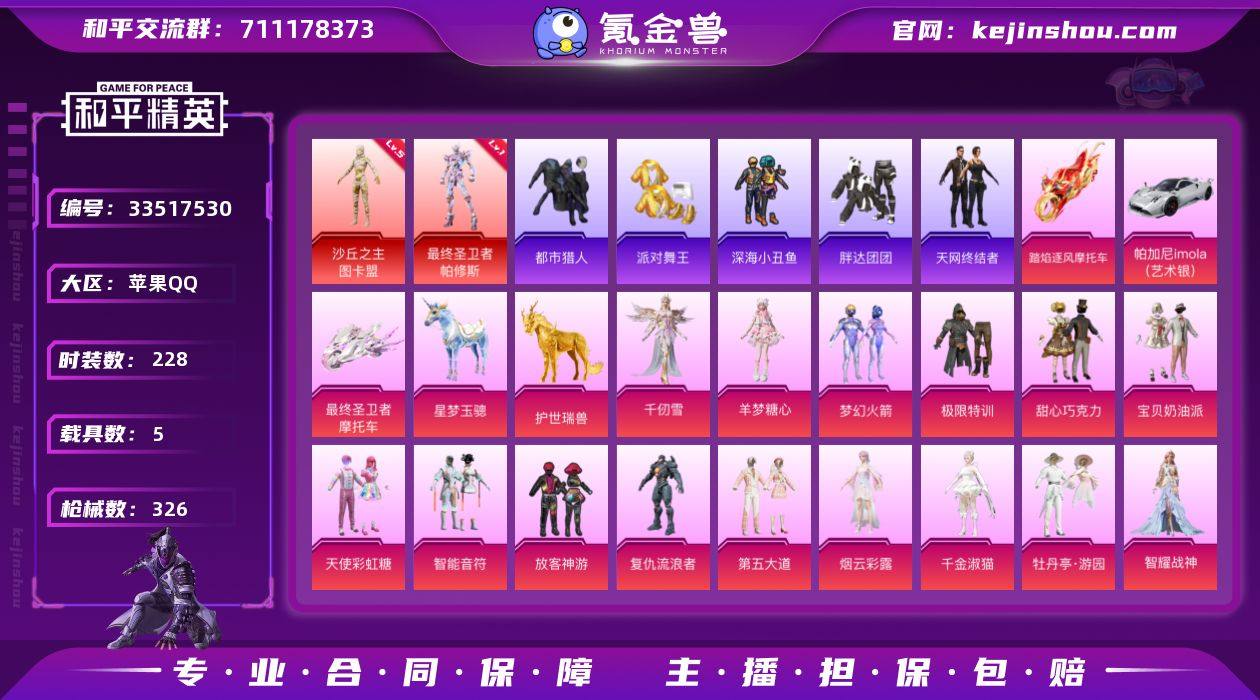 苹果 手Q-2神装-17粉装-18特效枪-5载具-17粉色飞行器-124869热力值-17王牌印记-228套装-326枪皮 【红色神装等级】:最终圣卫者-帕修斯(一级),沙丘之主-图卡盟(五级) 【红色角色神装】:最终圣卫者-帕修斯,沙丘之主-图卡盟 【热门品类】:粉装-梦幻火箭,套装-浪漫天命,套装-都市猎人,套装-派对舞王,套装-深海小丑鱼,套装-小丑鱼,角色-军刀雅典娜,套装-胖达团团,套装-天网终结者,套装-龟仙人,角色-Mark.06,套装-红熊茄茄 【粉色套装】:粉装-极限特训,粉装-甜心巧克力,粉装-宝贝奶油派,粉装-天使彩虹糖,粉装-梦幻火箭,粉装-智能音符,粉装-放客神游,角色-复仇流浪者,粉装-第五大道,角色-烟云彩露,角色-千金淑猫,粉装-牡丹亭·游园,角色-智耀战神,粉装-湮灭星辰,粉装-幻彩电音,角色-羊梦糖心,角色-千仞雪 【粉色枪皮等级】:AKM-炫紫旋律(五级),SCAR-L-青春物语(五级),SCAR-L-魔童闹海 哪吒(六级),M416-墨龙九天(三级),GROZA-镜光银凌(五级),AUG-许七安(五级),Vector-环太平洋(七级),AKS-74U-星穹咏叹调(五级),P90-沙丘之主(一级),Kar98K-巳巳如意(五级),M24-镜域双华(一级),Mk14-精灵梦叶罗丽(六级),M417-第五大道(一级),DP-28-豹影疾...