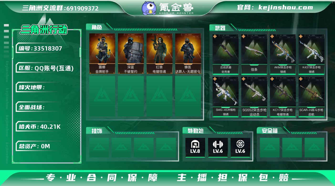 【包人脸】203M 40214K哈夫币 60-烽火等级 778-三角币和劵 115级通行证已开 50-战场等级 【近战武器】 信条 处刑者 黑鹰 【干员外观】 蜂医-送葬人·无题密令 深蓝-不破誓约 红狼-电锯惊魂 露娜-金牌射手 【传说枪皮】 725双管霰弹枪-送葬人-无题密令 UZI冲锋枪-特斯拉线圈 AK-12突击步枪-特斯拉线圈 SR-3M紧凑突击步枪-特斯拉线圈 M16A4突击步枪-狩猎时刻 G3战斗步枪-狩猎时刻 Vector冲锋枪-狩猎时刻 M4A1突击步枪-阿米娅 SCAR-H战斗步枪-启航 AKM突击步枪-锦绣 K437突击步枪-锦绣 SMG-45冲锋枪-锦绣 ASh-12战斗步枪-鹅鸭杀 QJB201轻机枪-鹅鸭杀 QCQ171冲锋枪-鹅鸭杀 K437突击步枪-几何解构 KC17突击步枪-电锯惊魂 SG552突击步枪-运动员 【史诗枪皮】 PKM通用机枪-蝮蛇 M700狙击步枪-蝮蛇 M250通用机枪-囚徒 SV-98狙击步枪-囚徒 腾龙突击步枪-无垢 MP7冲锋枪-无垢 PSG-1射手步枪-无垢 SVD狙击步枪-荒野求生 SR-3M紧凑突击步枪-荒野求生 PKM通用机枪-荒野求生 SV-98狙击步枪-林中猎手 SVD狙击步枪-阿萨拉工艺 M700狙击步枪-竞技风 SG552突击步枪-深海恐惧 S12K霰弹枪-曙光 沙漠之鹰-曙光 Ash-12战斗步枪-飓风行动 AUG突击步枪-蝮蛇