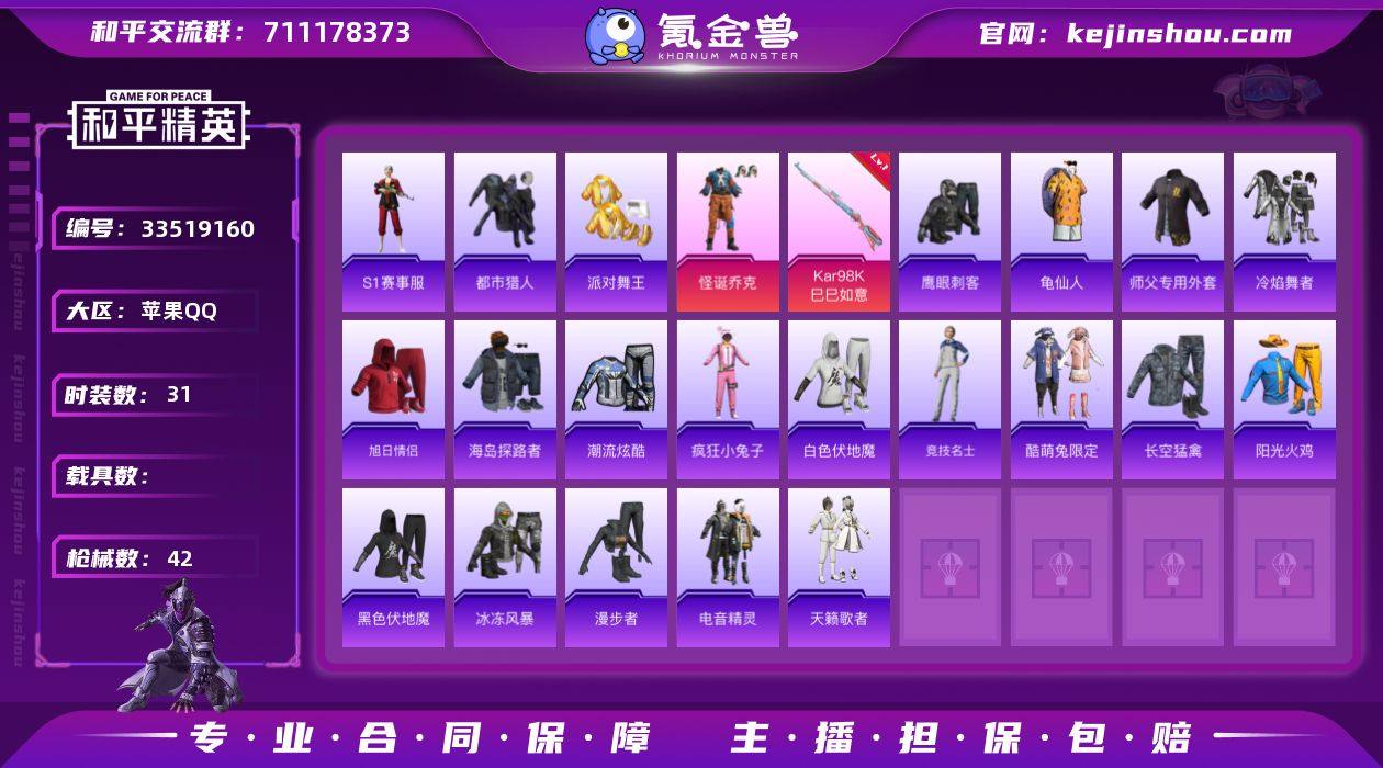 苹果 手Q-1粉装-3特效枪-0载具-2粉色飞行器-11447热力值-2王牌印记-31套装-42枪皮 【热门品类】:粉装-怪诞乔克,套装-S1赛事,套装-都市猎人,套装-派对舞王,套装-龟仙人,师父专用外套 【粉色套装】:粉装-怪诞乔克 【粉色枪皮等级】:Kar98K-巳巳如意(一级),Mk14-福马献瑞(五级),AA12-G-萌骑幻想(五级) 【粉色枪皮】:Kar98K-巳巳如意,Mk14-福马献瑞,AA12-G-萌骑幻想 【粉色飞行器】:光之祷告飞行器,幻骨萌王飞行器 【粉色降落伞】:洛神天依降落伞 【稀有套装】:套装-龟仙人,角色-阿虎,套装-马上来财,套装-雨过天青,套装-红釉青花 【稀有枪皮】:AKM-龙的传人,SCAR-L-夜灯,GROZA-影袭,AUG-甜蜜菠萝,QBZ-洛神天依,Mk47-洛神天依,G36C-星穹咏叹调,AC-VAL-彩虹甜喵,UZI-天降萌叽,UZI-影袭,汤姆逊-像素花束,P90-巳巳如意,Kar98K-影袭,Kar98K-洛神天依,M24-影袭,Mk14-银夜幻翼,MK20-H-绶带小兔,DBS-彩虹符号,DP-28-彩虹符号 【其他套装】:套装-冷焰舞者,套装-旭日情侣,套装-海岛探路者,套装-潮流炫酷,套装-疯狂小兔子,套装-白色伏地魔,套装-竞技名士,套装-酷萌兔限定,套装-长空猛禽,套装-阳光火鸡,套装-黑色伏地魔,套装-龟仙人,套...