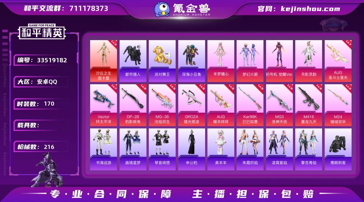 安卓 手Q-1神装-4粉装-12特效枪-0载具-6粉色飞行器-70590热力值-11王牌印记-170套装-216枪皮 【红色神装等级】:沙丘之主-图卡盟(三级) 【红色角色神装】:沙丘之主-图卡盟 【热门品类】:粉装-梦幻火箭,套装-都市猎人,套装-派对舞王,套装-深海小丑鱼,套装-龟仙人,套装-暗影哥特,套装-粉红小猪,角色-8号机,角色-Mark.06 【粉色套装】:粉装-梦幻火箭,角色-初号机 觉醒Ver.,角色-月影灵韵,角色-羊梦糖心 【粉色枪皮等级】:M416-墨龙九天(三级),GROZA-镜光银凌(五级),AUG-暖羊咩咩(五级),AUG-圣斗士星矢(七级),Vector-环太平洋(七级),AKS-74U-森灵之息(五级),Kar98K-巳巳如意(五级),M24-镜域双华(三级),Mk14-福马献瑞(三级),DP-28-豹影疾电(五级),MG3-洛神天依(五级),MG-36-沧焰双生(五级) 【粉色枪皮】:M416-墨龙九天,GROZA-镜光银凌,AUG-暖羊咩咩,AUG-圣斗士星矢,Vector-环太平洋,AKS-74U-森灵之息,Kar98K-巳巳如意,M24-镜域双华,Mk14-福马献瑞,DP-28-豹影疾电,MG3-洛神天依,MG-36-沧焰双生 【粉色飞行器】:酣梦熊熊飞行器,炫彩糖果飞行器,祥瑞起舞飞行器,沙丘之主天马,龙翔九天飞行器,万象金身飞行器 【粉色降落伞】:幻影战神降落...
