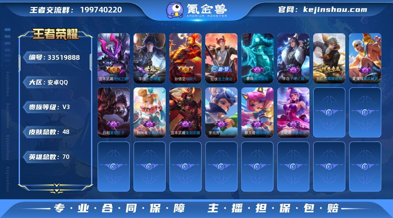 [18806759]V3 5传说 70英雄 48皮肤 可二次 可修改实名 男号 【稀有英雄】嬴政(始皇帝),娜可露露(鸟人),不知火舞,赵云,戈娅 【传说皮】神树通天,地狱火,地狱之眼,一念神魔 【赛季/战令皮】海盐诗旅(s30),天穹祈灯(s34) 【史诗皮】线条小狗-周瑜,龙之律动,千年之狐,偶像歌手,末日机甲-吕布,猫狗日记-大乔,水果甜心,星夜王子,幽灵船长,鬼剑武藏,舞动绿茵,乘风破浪,逐浪之夏,鹰眼统帅 【限定皮】鸣野蒿,李小龙 【普通皮】无尽旅途,鹤鸣心笺,溯影追猎,罗小黑战记-哪吒,荣光之誓,鬼谷子天穹祈灯(S34),守护之力,西部大镖客(牛魔),阴阳师,兔女郎,死亡骑士,秘密基地,爱心护理,救世之瞳,未来纪元-宫本武藏,拳王,阿尔法小队,灼热之刃,踏雪寻梅,地府判官,维京掠夺者,东海龙王,创世神祝,西部大镖客-孙悟空,帝国元帅,唤灵魔甲,潮玩探月行