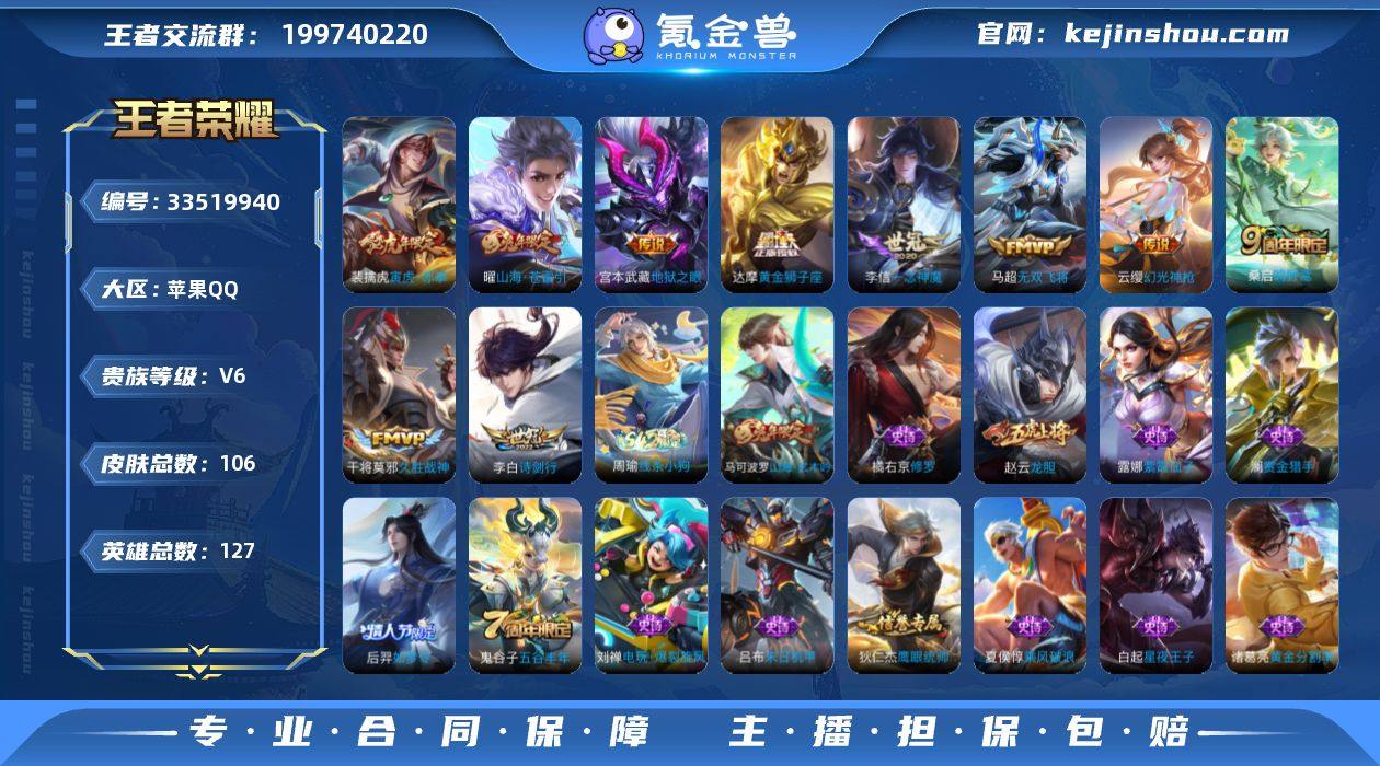 实名: 可修改 性别: 男号 贵族等级: V6 英雄数: 127 皮肤数: 106 传说皮: 黄金狮子座,久胜战神,一念神魔,地狱之眼,无双飞将,山海·苍雷引,幻光神枪 限定皮: 龙胆,如梦令-后羿,高山流水,寅虎·赤拳,五谷丰年,诗剑行,山海·玄木吟,鸣野蒿 亮点: 【优质装备】:黄金狮子座,久胜战神,一念神魔,地狱之眼,无双飞将,山海·苍雷引(电光曜子)