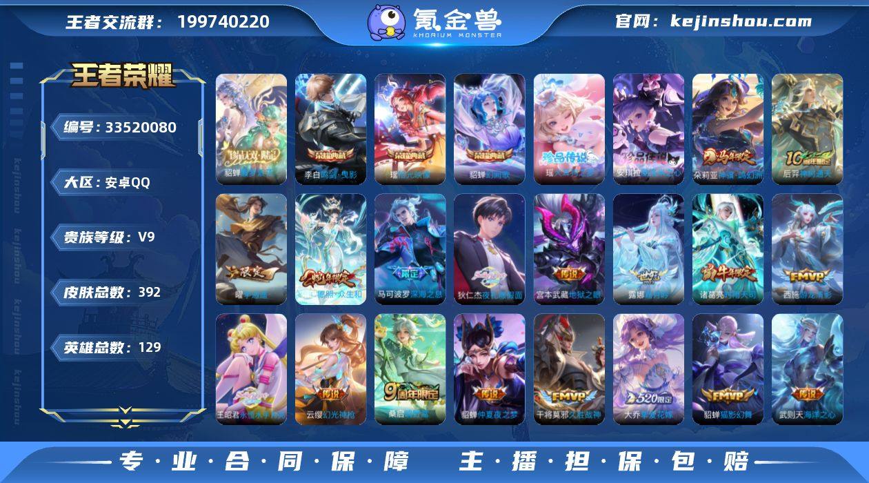 【王者荣耀】珍品无双1 典藏4 无双0 珍品传说2 传说28 史诗133 英雄129 皮肤392 贵族9级 珍品无双:馥梦繁花__荣耀典藏:武则天|幻阙歌|鸣剑·曳影|拾光映像__珍品传说:大耳狗之梦|酷洛米之心__传说皮肤:鸣野蒿|深海之息|挚爱花嫁|孙尚香-异界灵契|启明星使|地狱之眼|海洋之心|仲夏夜之梦|久胜战神|猫影幻舞|飞鸢探春|李逍遥|游龙清影|乞巧织情|瑶-时之祈愿|电玩·雷克斯|时雨天司|霜月吟|项羽-无限倾心|小乔-音你心动|星穹之声|夜礼服假面|永恒水手月亮|虞姬-无限倾心|幻光神枪|愿照·众生和|神树通天|神骥·鸣幻洲__稀有限定:寅虎·展翼|寅虎·心曲|白晶晶|白鹤梁神女|女儿国国王|傲雪梅枪|玉兔公主|李小龙|梁祝|山海·碧波行|时之彼端|拒霜思|百解令|百里守约-真我赫兹|大漠名商|地狱燃心|电玩高手|繁星吟游|凤凰于飞|高山流水|古海寻踪|海滩派对|海盐诗旅|航海奇遇记|胡桃异想国|幻夜卜梦|皇家上将|火炮绅士|剑破天穹|江河有灵|金庭之子|狂想玩偶喵|黎明之约|魔术师|花木兰-默契交锋|匿光追影者|奇幻香踪|千军破阵|擒涛扼浪|青焰无极|驱傩正仪|燃音魔法|荣光圣徽|沙漠行僧|探海日志|醍醐杖|天狼溯光者|天穹祈灯|玩趣恶龙|万华元夜|无心|五谷丰年|午后时光|纤云弄巧|星界游侠|演武夺...