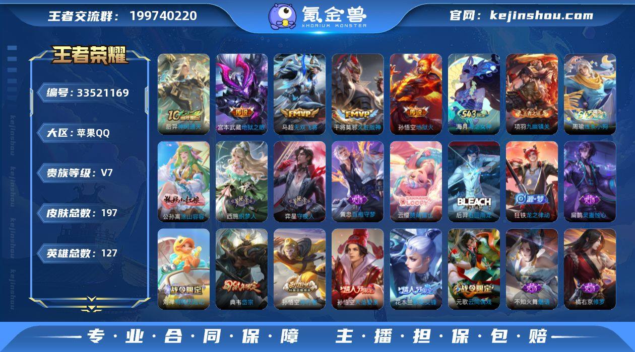 实名: 可修改 性别: 男号 贵族等级: V7 英雄数: 127 皮肤数: 197 传说皮: 久胜战神,地狱火,地狱之眼,无双飞将,神树通天 限定皮: 李小龙,岱宗,时之彼端,如梦令-后羿,大圣娶亲,默契交锋-花木兰,孙行者 亮点: 【优质装备】:久胜战神,地狱火,地狱之眼,无双飞将,涂山容容
