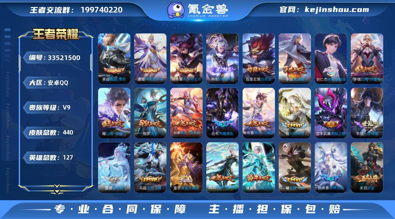 V9 3典藏 1无双 47传说 127英雄 440皮肤 可修改实名 男号 【英雄全皮】敖隐全皮,空空儿全皮,蚩奼全皮,金蝉全皮,猪八戒全皮 【稀有英雄】敖隐(小龙人),大司命,嬴政(始皇帝),韩信(韩跳跳),夏洛特(夏师傅),艾琳,橘右京(橘子),娜可露露(鸟人),不知火舞,赵云,金蝉(唐僧),戈娅 【荣耀水晶】神鉴启示录,鸣剑·曳影,杀手不太冷 【无双皮】韩信群星魔术团(韩信无双) 【传说皮】黄金天蝎座,乘龙·淬吴钩(孙策年限),乘龙·铭钟鼎(赵云年限),乘龙·问璇玑(孙尚香年限),神树通天,游龙清影(小青龙),山海·炽霜斩(李信年限),山海·琳琅生(小乔年限),黄金射手座,黄金白羊座,地狱火,仲夏夜之梦(大飞蛾),地狱之眼,末日机甲-孙尚香(绿蚂蚱),云霓雀翎,一念神魔,淬星耀世,久胜战神,云鹰飞将(小将军),炽阳神光,无双飞将,音你心动-小乔,音你心动-周瑜,胖达荣荣,乞巧织情,时之恋人-刘备(电焊工),飞鸢探春,绛天战甲(鸡嘴战神),超时空战士-狄仁杰,末日机甲-孙策,挚爱之约,音你闪耀(rap皮),山海·苍雷引(电光曜子),记忆之芯(机甲兔),夜礼服假面,霜月吟,澜逐花归海 【珍宝阁皮】妄想食味,万物之道,优雅恋人,蔷薇恋人,女武神 【赛季/战令皮】古海寻踪(s33),海盐诗旅(s30),擒涛扼浪(s31),潮玩骑兵,奇幻香踪,探海日...