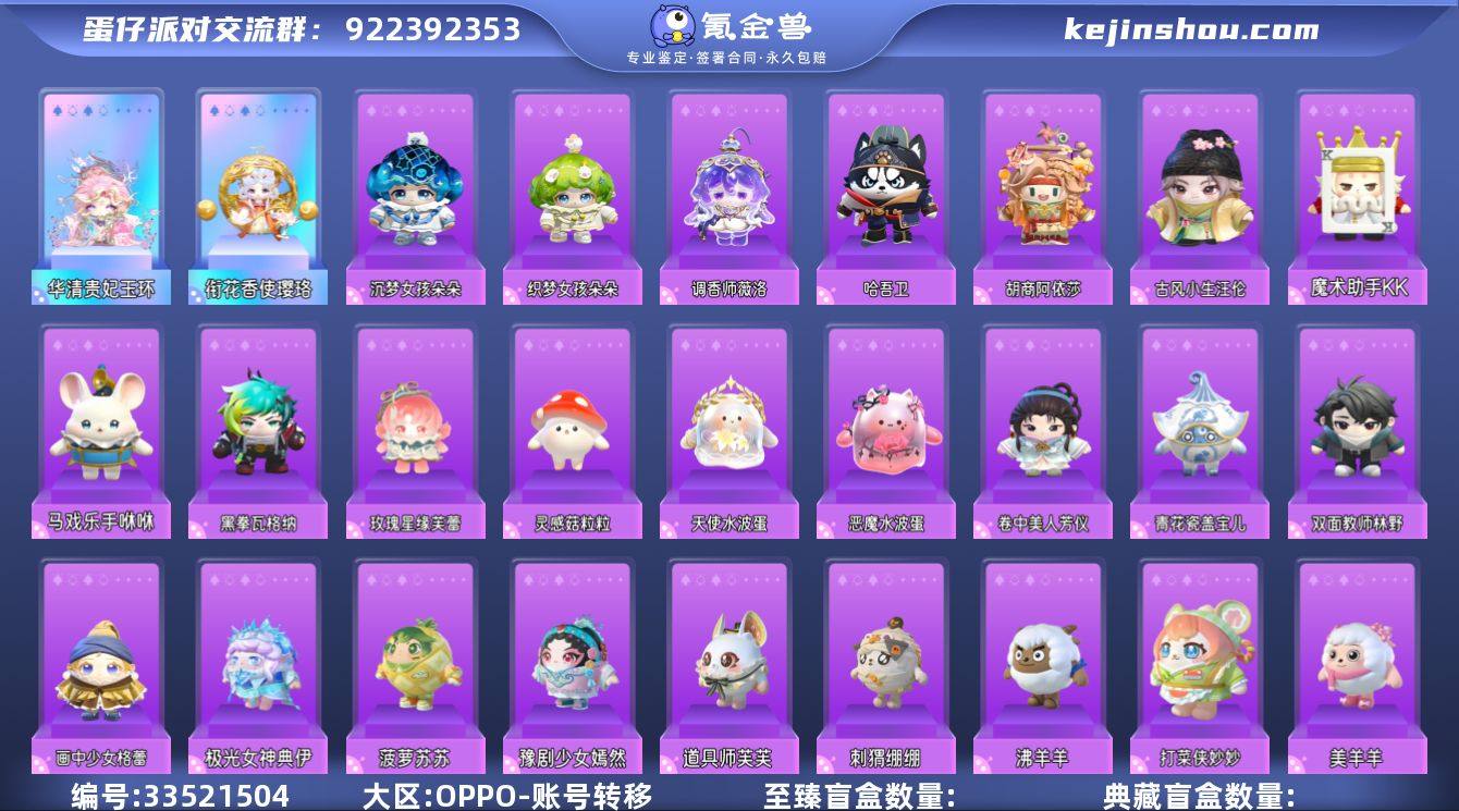 华清贵妃玉环,衔花香使璎珞 沉梦女孩朵朵,织梦女孩朵朵,调香师薇洛,古风小生汪伦,胡商阿依莎,哈吾卫,魔术助手KK,马戏乐手咻咻,黑拳瓦格纳,玫瑰星缘芙蕾,灵感菇粒粒,恶魔水波蛋,天使水波蛋,卷中美人芳仪,青花瓷盖宝儿,双面教师林野,画中少女格蕾,极光女神典伊,菠萝苏苏,八音盒温妮,刺猬绷绷,打菜侠妙妙,道具师芙芙,袋鼠嘟宝,沸羊羊,海藻偷偷,京剧少年封闲,剑侠客,流浪小象哆哆,莓莓甜心兔,魔灯闪闪,美羊羊,饶舌诗人,饶舌小子,失心熊,小福袋添运,雪怪瓦图鲁,小灰灰,小演员露希,豫剧少女嫣然,仔仔熊 段位:四阶鹅蛋