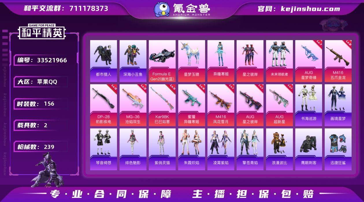苹果 手Q-1神装-3粉装-15特效枪-2载具-4粉色飞行器-75711热力值-7王牌印记-156套装-239枪皮 【红色神装等级】:百变纱华-安妮(二级) 【红色角色神装】:百变纱华-安妮 【热门品类】:套装-浪漫天命,套装-都市猎人,套装-深海小丑鱼,套装-小丑鱼,套装-忍者信条,套装-龟仙人,套装-暗影哥特,套装-浪漫波比,套装-粉红小猪,角色-Mark.06 【粉色套装】:粉装-星之彼岸,粉装-未来领航者,角色-异瞳寒姬 【粉色枪皮等级】:M416-五爪金龙(六级),M416-风花雪月(一级),AUG-星之彼岸(一级),AUG-超新星(一级),AUG-星梦奇缘(七级),蜜獾-异瞳寒姬(四级),AKS-74U-森灵之息(五级),Kar98K-巳巳如意(五级),Mk14-福马献瑞(五级),AA12-G-萌骑幻想(二级),DP-28-豹影疾电(五级),MG-36-沧焰双生(五级),信号枪-金乌曜日(一级),燃烧瓶-薄荷可可(六级) 【粉色载具】:Formula E Gen2(幽光蓝),星梦玉骢 【粉色枪皮】:M416-五爪金龙,M416-风花雪月,AUG-星之彼岸,AUG-超新星,AUG-星梦奇缘,蜜獾-异瞳寒姬,ACE32-百变纱华,AKS-74U-森灵之息,Kar98K-巳巳如意,Mk14-福马献瑞,AA12-G-萌骑幻想,DP-28-豹影疾电,MG-36-沧焰双生,信号枪-金乌曜日,燃烧瓶-薄荷可可 【粉色飞...