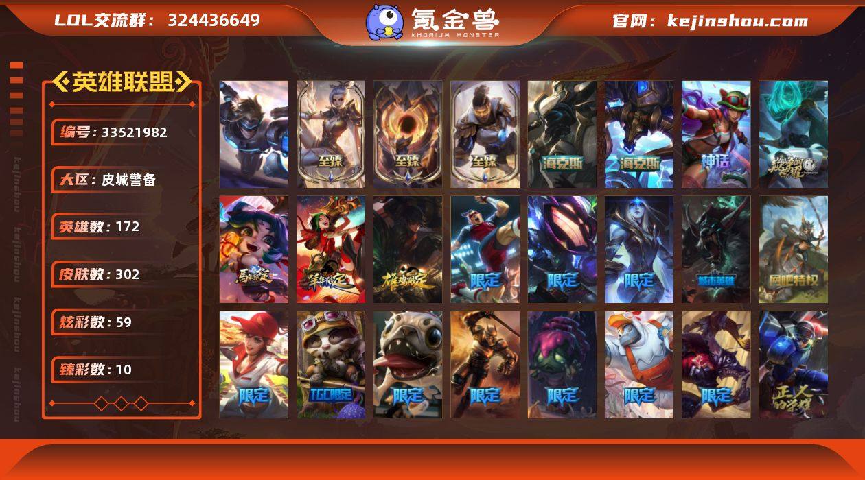 t39579【皮城警备】 302皮肤 59炫彩 10臻彩 9神话/44限定/28传说/172英雄 账号等级:712 【重要头像】云顶战斗学院伊泽瑞尔 觅心游侠卢锡安 觅心之翼奎因 雪花 我麦是开的么 披萨鸡 送披萨的小姐姐希维尔 此志无双羽饰骑士 【重要皮肤】未来战士卢锡安至臻 暗星墨菲特至臻 玉剑传说武剑仙至臻 海克斯科技阿利斯塔 零之枪骑赫卡里姆 玉剑传说舞龙卫 点心宝贝阿木木 神龙烈焰金克丝 虎痴之拳蔚 龙马烈焰波比 胜利女神奥莉安娜 胜利枪神卢锡安 胜利之剑亚托克斯 觅心女王艾希 雪球也能爆炸吉格斯 魄罗骑士瑟庄妮 泳池派对格雷福斯 泳池派对蕾欧娜 御星魔矢艾希 送披萨的小姐姐希维尔 鸡里奥 克格汪 制胜金靴李青 FPX普朗克 SKTT1阿兹尔 SKTT1伊莉丝 SSW图奇 SSW辛吉德 SKTT1薇恩 暗杀星慎 Fnatic迦娜 冰雪节辛吉德 防暴天使凯尔 鬼影森森茂凯 胡桃夹子萨科 惊悚派对阿木木 警用试作体K9内瑟斯 密林猎手提莫 南瓜头费德提克 圣诞狂欢努努和威朗普 圣诞老人古拉加斯 幸福女神乐芙兰 野兽猎人瑟庄妮 暗影沃里克 战场BOSS吉格斯 阿木木主人不要我了 都铎王朝图奇 十五周年纪念希维尔 十周年纪念安妮 源代码乐芙兰 神凰行...
