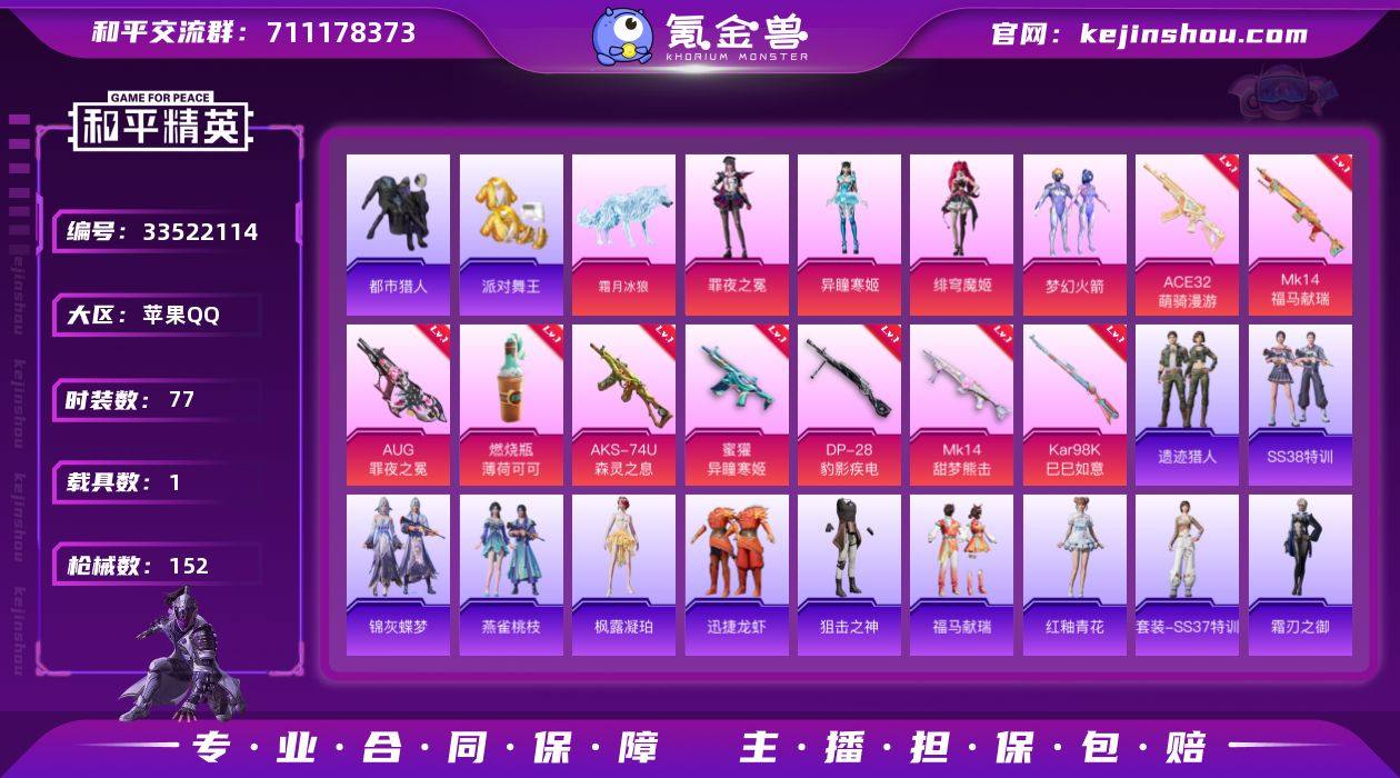 【AUG罪夜之冕都市男神金鞋9特效枪4粉装1载具 秒换绑不用等】 苹果Q区-41188热力值-77套装-152枪皮 【1载具】 霜月冰狼【2稀有】 都市猎人 派对舞王(金靴子)【4粉装】 梦幻火箭 罪夜之冕 角色-异瞳寒姬 角色-绯穹魔姬【9特效枪】 AKS-74U-森灵之息(5级) 燃烧瓶-薄荷可可(5级) AUG-罪夜之冕(5级) Mk14-福马献瑞(5级) ACE32-萌骑漫游(2级) 蜜獾-异瞳寒姬(7级) Kar98K-巳巳如意(5级) Mk14-甜梦熊击(5级) DP-28-豹影疾电(5级)【160热门】 都市猎人(蓝口罩) SS24特训 Mini14-梦幻火箭 M762-彩虹符号 Mk47-乌木金纹 UMP45-蓝色火焰 DBS-彩虹符号 AKM-星之彼岸 鹰眼刺客 M416-蓝色火焰 破蛋小黄鸡 长空猛禽 漫步者 海岛探路者 S1897-糯团青竹 AA12-G-雨过天青 Famas-霜月狼主 沙漠之鹰-雨过天青 P90-霜月狼主 Mini14-绯穹魔姬 平底锅-画境星梦 P90-紫矿核心 GROZA-紫矿核心 M16A4-雨过天青 顶瓜瓜 Vector-荒原烈焰 M416-魔童闹海 敖闰 雨过天青 MG-36-薄荷星砂 GROZA-福马献瑞 恋语绒绒 SS34特训 AA12-G-橘猫汽水 朱霞炽焰 蜜獾-鸡智如我 星影赞美诗 撬棍-冰晶雪宝 时希公主 福马献瑞 大橘大利 M200-罪夜之冕 霜刃之御 燃点复合弓-罪夜之冕 凌霄紫焰 蓝冰羽 SPAS-12-罪夜之冕 莫辛...