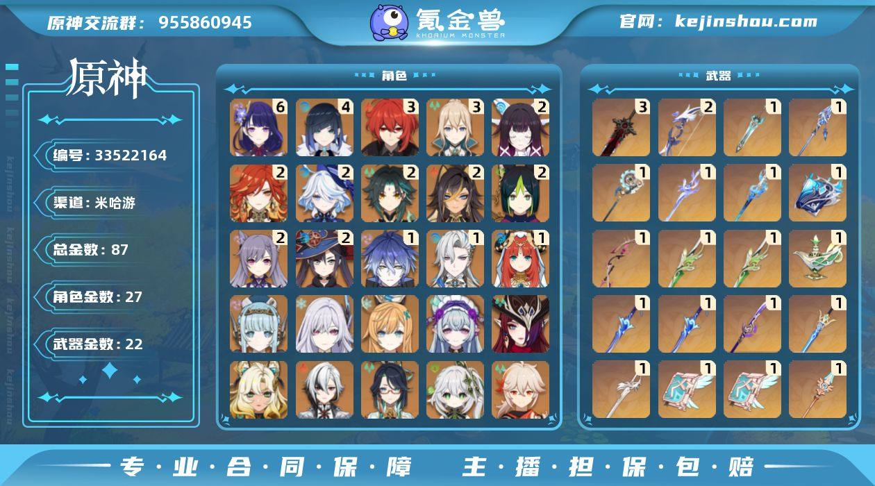 小保底垫了差不多70来抽,号很欧小保底歪的次数很少,可以看常驻角色的命座没有太高的,还有很多是常驻池子捞出来的,很多40多分的圣遗物还有50多分的,可轻松n5,n6看环境,配对齐全。连体崩铁也有点角色。