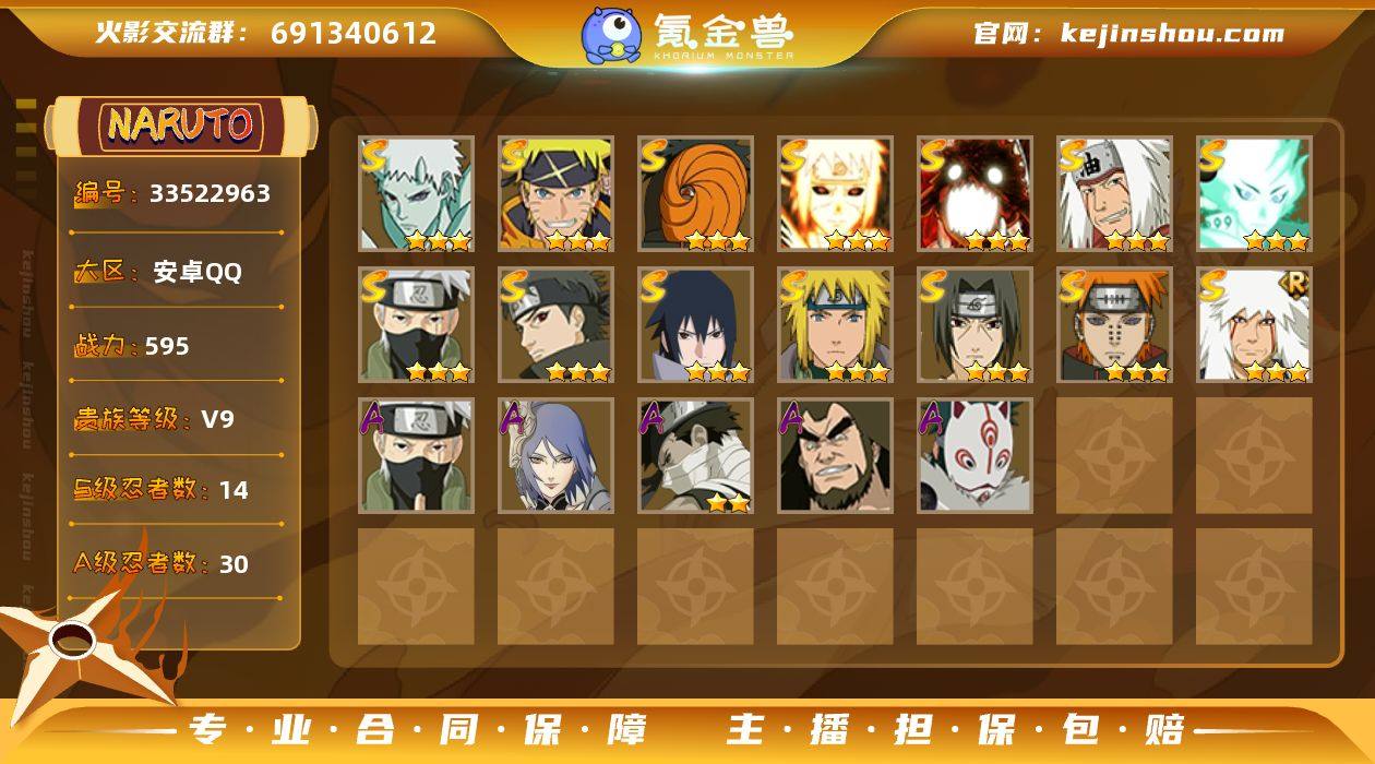 【火影忍者】战斗力:595W+;段位:中忍1阶;本服排名:1267;VIP:V9级;S忍:14个;A忍:30个;通灵兽:14个,S忍:十尾人柱力宇智波带土|须佐能乎旗木卡卡西|九喇嘛连结波风水门|五影会谈宇智波斑|天道佩恩|传说中的三忍自来也|漩涡鸣人宇智波佐助|须佐能乎宇智波止水|永恒万花筒宇智波佐助|最终章大筒木舍人|舞之豪杰自来也|波风水门|须佐能乎宇智波鼬|暴怒第六尾漩涡鸣人__A忍:青春爆炸迈特凯|仙人模式巳月|幻之真容旗木卡卡西|忍界大战李洛克|秽土转生角都|忍界大战日向宁次|忍者之路神秘面具男|九尾查克拉漩涡鸣人|忍界大战秋道丁次|万花筒写轮眼宇智波佐助|死司凭血飞段|疾风传我爱罗 * 3星|迪达拉(普通)|飞段(普通) * 3星|神驹佑将小南|神威对决旗木卡卡西|迈特凯(普通) * 3星|宇智波鼬(普通)|夏日限定宇智波鼬|干柿鬼鲛(普通)|秽土转生桃地再不斩|绯流琥蝎|蝎(普通)|猿飞阿斯玛(普通) * 3星|桃式显现漩涡博人|宇智波泉奈|羁绊神农|忍界大战土台|初始形态机械鸣人|侠隐江湖大野木__通灵兽:忍犬(普通)|蓝蛇|蛤蟆吉|忍龟|镰鼬|砂之守鹤|猿魔|山椒鱼|蜃|鲛鲨|蛤蟆仙人|蛤蟆健|蛞蝓(普通)|乌鸦(普通)