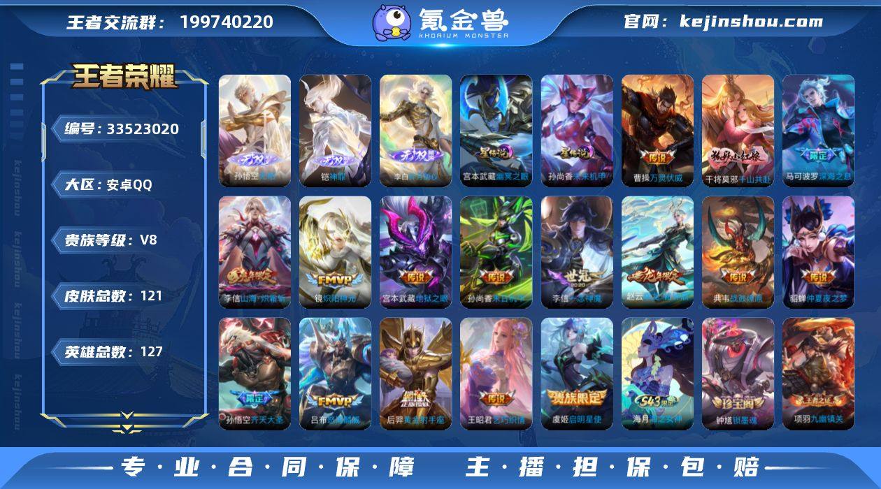 【aswz2230】安卓Q-V8-至尊星耀I段位-127英雄-121皮肤-3无双-16传说-41史诗 【无双皮肤】:孙悟空无相,铠神罪,李白碎月剑心 【传说皮肤】:曹操万灵伏威,干将莫邪千山共赴,典韦战鼓燎原,赵云乘龙铭钟鼎,孙悟空齐天大圣,李信山海炽霜斩,吕布怒海麟威,马可波罗深海之息,王昭君乞巧织情,镜炽阳神光,虞姬启明星使,李信一念神魔,后羿黄金射手座,貂蝉仲夏夜之梦,孙尚香末日机甲,宫本武藏地狱之眼 【限定皮肤】:狄仁杰阴阳师,赵云皇家上将,高渐离玩趣恶龙,芈月白晶晶,元歌无心,马可波罗深海之息,狄仁杰魔术师,达摩沙漠行僧,项羽海滩派对,王昭君午后时光,孙悟空至尊宝,孙悟空齐天大圣,李元芳云中旅人,虞姬启明星使,鬼谷子五谷丰年,百里守约朱雀志,沈梦溪大漠名商,裴擒虎擒涛扼浪,狂铁电玩高手,云中君纤云弄巧,李信山海炽霜斩,上官婉儿梁祝,鲁班大师探海日志,桑启海盐诗旅,张良古海寻踪,鬼谷子天穹祈灯,李白碎月剑心,赵云乘龙铭钟鼎,刘邦剑破天穹 【年限皮肤】:百里守约朱雀志,李信山海炽霜斩,赵云乘龙铭钟鼎 【赛季限定】:达摩沙漠行僧,沈梦溪大漠名商,李元芳云中旅人,桑启海盐诗旅,裴擒虎擒涛扼浪,鲁班大师探海日志,张良古...