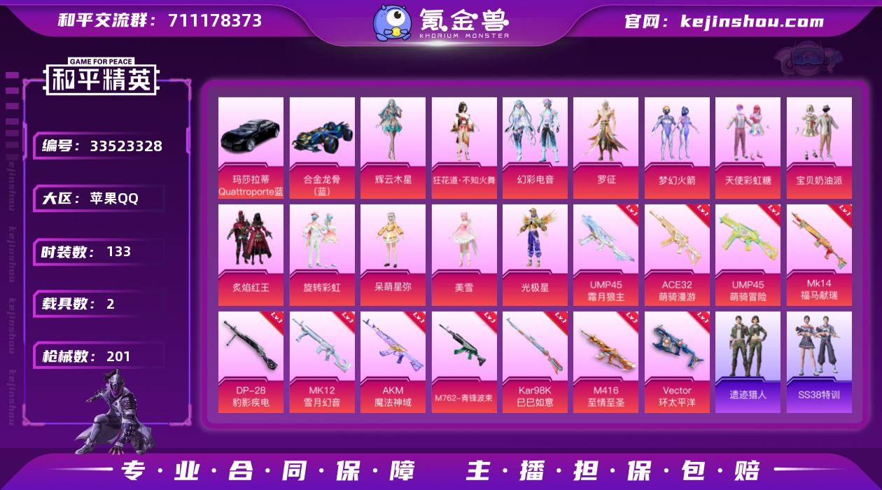 【满级M4至情至圣12粉装11特效枪2载具 秒换绑不用等】 苹果Q区-68880热力值-133套装-201枪皮 【2载具】 玛莎拉蒂Quattroporte(夜幕蓝) 合金龙骨(蓝)【12粉装】 梦幻火箭 宝贝奶油派 天使彩虹糖 旋转彩虹 辉云木星 炙焰红王 呆萌星弥 角色-罗征 角色-光极星 角色-狂花道·不知火舞 角色-美雪 幻彩电音【11特效枪】 M416-至情至圣(9级) AKM-魔法神域(3级) Mk14-福马献瑞(5级) UMP45-萌骑冒险(5级) ACE32-萌骑漫游(5级) UMP45-霜月狼主(3级) Vector-环太平洋(7级) M762-青锋波束(5级) MK12-雪月幻音(7级) Kar98K-巳巳如意(5级) DP-28-豹影疾电(5级)【220热门】 仓鼠灰灰 小丑鱼 迅捷狂鲨 SS27特训 SS26特训 SS25特训 NV战队服 M762-暖熊萌萌 AKM-环太平洋 SCAR-L-玉兔迎春 Mk47-乌木金纹 UZI-娇憨猪猪 UMP45-炫光之旅 S12K-垂柳戏鸭 M249-彩虹符号 MG3-幻世战舞者 呆萌铁蟹 万圣娃娃 破蛋小黄鸡 长空猛禽 弄潮海豚 青涩时光 牛气冲天 梦幻奶油 魅力单车 S686-奇异狩猎者 风暴特警 纯真浪花 春日漫步 汤姆逊-智耀战神 S1897-糯团青竹 AA12-G-雨过天青 Famas-霜月狼主 沙漠之鹰-雨过天青 P90-霜月狼主 MK47-林间仙鹿 情公主 M16A4-雨过天青 MP5K-未来领航者 AC-VAL-荒原烈焰 顶瓜...