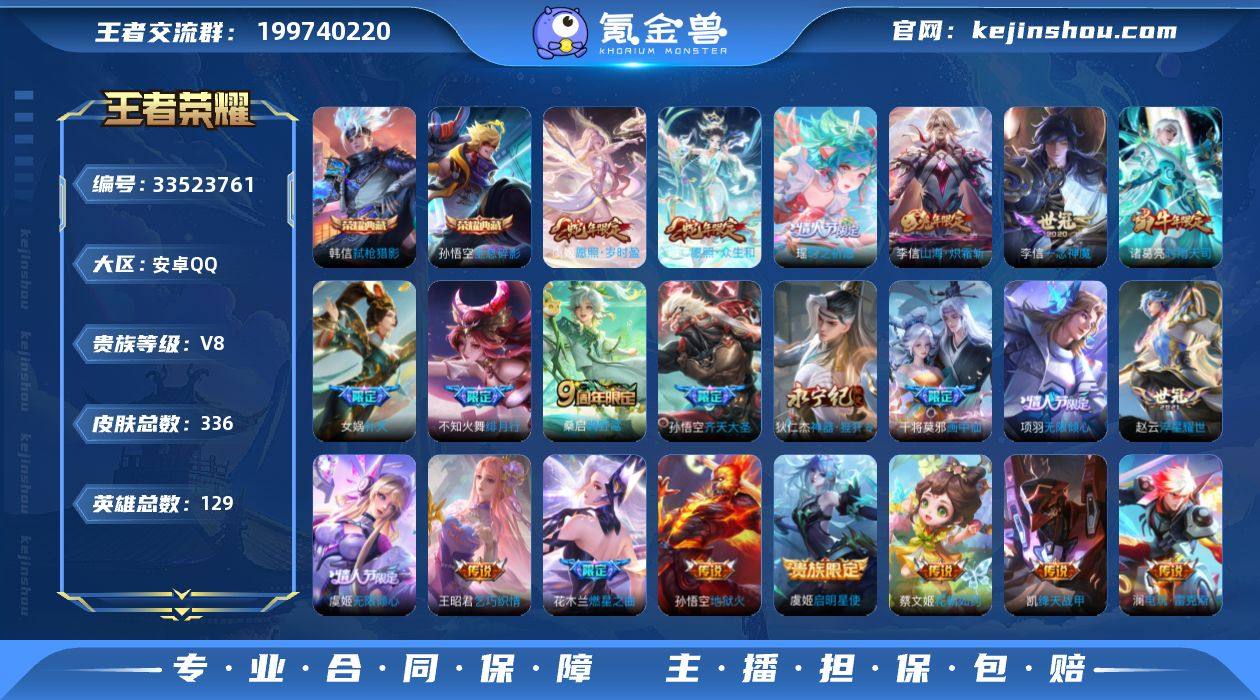 安卓Q-V8-尊贵铂金IV段位-129英雄-336皮肤-2典藏皮肤-22传说-83史诗 【英雄全皮】:孙权全皮,戈娅全皮,影全皮 【荣耀典藏】:孙悟空全息碎影,韩信弑枪猎影 【传说皮肤】:妲己愿照众生和,虞姬愿照岁时盈,桑启鸣野蒿,澜电玩雷克斯,干将莫邪画中仙,花木兰燃星之曲,虞姬无限倾心,项羽无限倾心,孙悟空齐天大圣,李信山海炽霜斩,狄仁杰神器狴犴令,不知火舞绯月行,蔡文姬花朝如约,女娲补天,瑶时之祈愿,赵云淬星耀世,王昭君乞巧织情,诸葛亮时雨天司,铠绛天战甲,虞姬启明星使,李信一念神魔,孙悟空地狱火 【限定皮肤】:杨戬破阵退雄兵,狄仁杰阴阳师,赵云皇家上将,妲己时之奇旅,嬴政优雅恋人,孙尚香蔷薇恋人,庄周高山流水,高渐离死亡摇滚,钟无艳超时空战士,孙膑天狼运算者,扁鹊奇幻香踪,白起夜都怪侠,芈月幻夜卜梦,元歌云间偶戏,元歌无心,夏侯惇朔风刀,甄姬女儿国国王,甄姬落雪兰心,马可波罗暗影游猎,狄仁杰魔术师,狄仁杰万华元夜,狄仁杰神器狴犴令,达摩沙漠行僧,项羽海滩派对,项羽无限倾心,老夫子醍醐杖,老夫子航海奇遇记,程咬金演武夺筹,韩信飞衡,韩信傲雪梅枪,王昭君午后时光,兰陵王金庭之子,花木兰燃星之曲,不知火舞绯月...