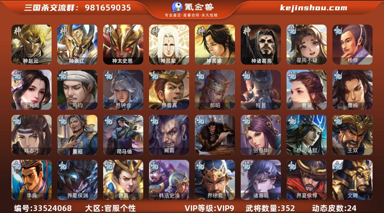 【14790217】官阶:大将军;VIP等级:VIP9;史诗武将数量:33;动态皮肤数量:24;武将总数:352;史诗宝珠数量:0;将魂数量:12136;神将:4;魏国史诗武将:16;蜀国史诗武将:8;吴国史诗武将:4;群史诗武将:7