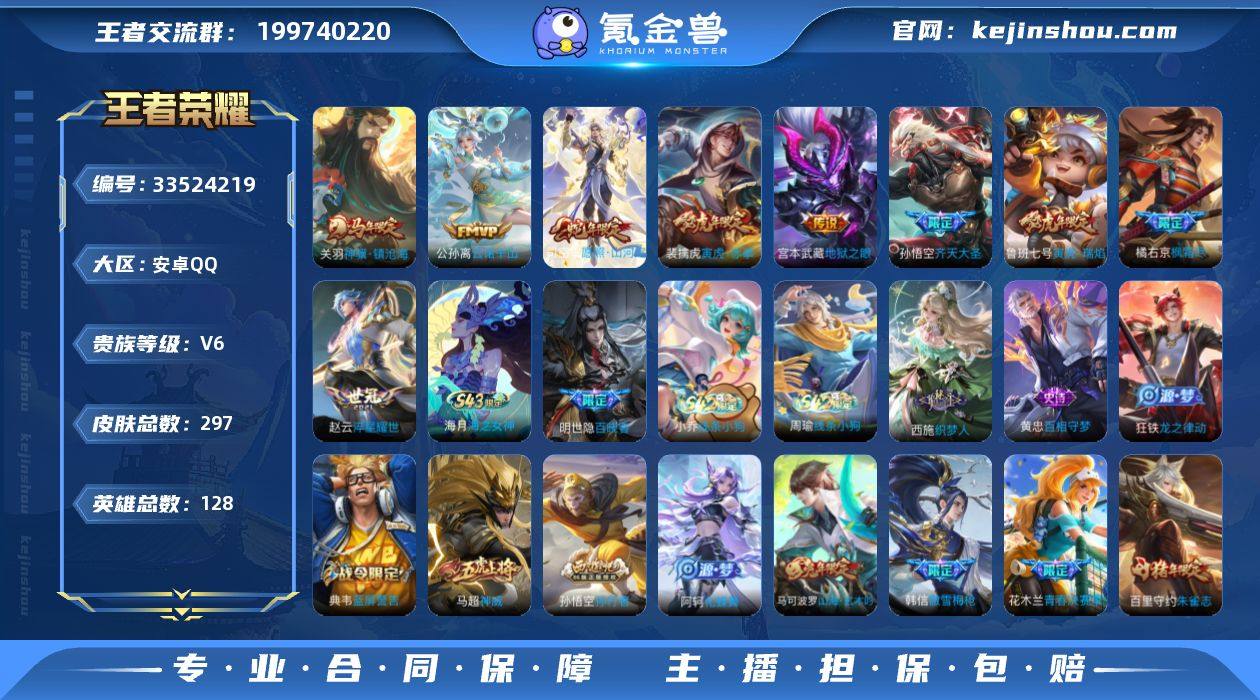 安卓Q-V6-永恒钻石III段位-128英雄-297皮肤-9传说-72史诗 【英雄全皮】:橘右京全皮,敖隐全皮,影全皮 【传说皮肤】:关羽神骥镇沧海,公孙离云诺千山,司空震愿照山河定,孙悟空齐天大圣,橘右京枫霜尽,裴擒虎寅虎赤拳,鲁班七号寅虎瑞焰,赵云淬星耀世,宫本武藏地狱之眼 【限定皮肤】:蒙犽顽岩魄,姜子牙天穹之誓,狄仁杰阴阳师,赵云皇家上将,墨子神迹守卫,嬴政白昼王子,孙尚香蔷薇恋人,鲁班七号寅虎瑞焰,庄周高山流水,高渐离玩趣恶龙,芈月重明,吕布猎兽之王,周瑜赤莲之焰,元歌无心,夏侯惇朔风刀,甄姬游园惊梦,典韦穷奇,典韦蓝屏警告,马可波罗山海玄木吟,狄仁杰魔术师,狄仁杰万华元夜,达摩沙漠行僧,项羽海滩派对,老夫子醍醐杖,老夫子航海奇遇记,程咬金演武夺筹,韩信傲雪梅枪,兰陵王驯魔猎人,兰陵王金庭之子,花木兰青春决赛季,橘右京枫霜尽,孙悟空孙行者,孙悟空齐天大圣,牛魔御旌,后羿圣弓游侠,李元芳云中旅人,钟馗驱傩正仪,杨玉环遇见飞天,女娲朔望之晖,干将莫邪真爱魔法,雅典娜黎明之约,蔡文姬繁星吟游,鬼谷子原初探秘者,鬼谷子五谷丰年,苏烈千军破阵,百里守约朱雀志,弈星混沌棋,沈梦溪大漠名商,明世隐疑决卦,裴擒虎李...