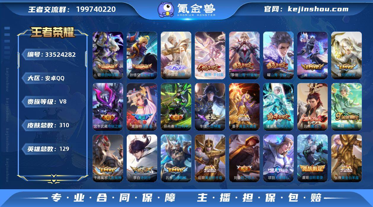 【Hwz1294】【精品打野】安卓Q-V8-打野40段-发育路41段-金标项羽、市标12、县标19-129英雄-310皮肤-2典藏皮肤-1无双-21传说-93史诗-银白咏叹调、无相、全息碎影、至尊宝 【英雄全皮】:孙权全皮,敖隐全皮,蒙恬全皮,空空儿全皮,影全皮 【荣耀典藏】:孙悟空全息碎影,铠银白咏叹调 【无双皮肤】:孙悟空无相 【传说皮肤】:虞姬愿照岁时盈,桑启鸣野蒿,墨子黄金天蝎座,吕布曦玄引,澜逐花归海,夏洛特浮生妄,项羽无限倾心,曜山海苍雷引,李信山海炽霜斩,吕布怒海麟威,李白诗剑行,诸葛亮时雨天司,镜炽阳神光,虞姬启明星使,李信一念神魔,刘备时之恋人,张良黄金白羊座,干将莫邪久胜战神,后羿黄金射手座,孙尚香末日机甲,宫本武藏地狱之眼 【限定皮肤】:蔡文姬夏日便利店,虞姬夏日便利店,姜子牙天穹之誓,狄仁杰阴阳师,赵云皇家上将,墨子降魔,孙尚香蔷薇恋人,高渐离玩趣恶龙,扁鹊奇幻香踪,芈月幻夜卜梦,吕布猎兽之王,周瑜赤莲之焰,元歌云间偶戏,元歌无心,典韦岱宗,马可波罗山海玄木吟,狄仁杰魔术师,狄仁杰万华元夜,达摩沙漠行僧,项羽海滩派对,项羽无限倾心,程咬金演武夺筹,兰陵王金庭之子,孙悟空至尊宝,孙悟空孙行者,后羿如梦令,刘备...
