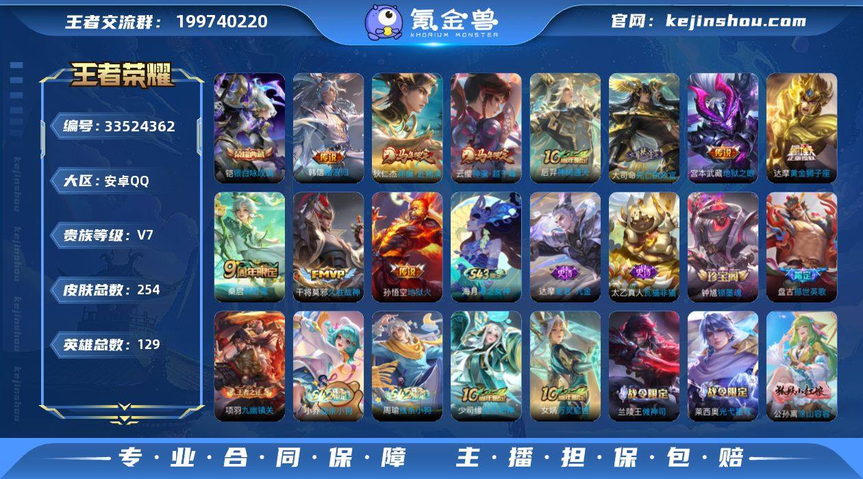 安卓Q-V7-永恒钻石IV段位-129英雄-254皮肤-1典藏皮肤-10传说-70史诗 【英雄全皮】:孙权全皮,大司命全皮,敖隐全皮,空空儿全皮,影全皮 【荣耀典藏】:铠银白咏叹调 【传说皮肤】:韩信踏浪归,云缨神骥越千峰,狄仁杰神骥赴朔漠,后羿神树通天,大司命死亡执政官,桑启鸣野蒿,干将莫邪久胜战神,达摩黄金狮子座,宫本武藏地狱之眼,孙悟空地狱火 【限定皮肤】:虞姬夏日便利店,姜子牙天穹之誓,狄仁杰阴阳师,赵云皇家上将,孙尚香蔷薇恋人,庄周高山流水,高渐离死亡摇滚,白起夜都怪侠,狄仁杰魔术师,达摩沙漠行僧,项羽海滩派对,兰陵王金庭之子,李元芳云中旅人,雅典娜黎明之约,鬼谷子五谷丰年,百里玄策原初追逐者,沈梦溪大漠名商,明世隐吟游魔法,裴擒虎擒涛扼浪,米莱狄胡桃异想国,云中君纤云弄巧,西施玲珑珍味,鲁班大师探海日志,桑启海盐诗旅,阿古朵江河有灵,张良古海寻踪,蒙犽百解令,蒙恬荣光圣徽,鬼谷子天穹祈灯,伽罗琥珀纪元,姬小满妄想食味,沈梦溪龙舞盛年,刘邦剑破天穹,程咬金群星魔术团,镜青焰无极,项羽苍威无极,周瑜熔金海岸 【赛季限定】:达摩沙漠行僧,兰陵王金庭之子,沈梦溪大漠名商,李元芳云中旅人,桑启海盐诗旅,裴擒虎擒...
