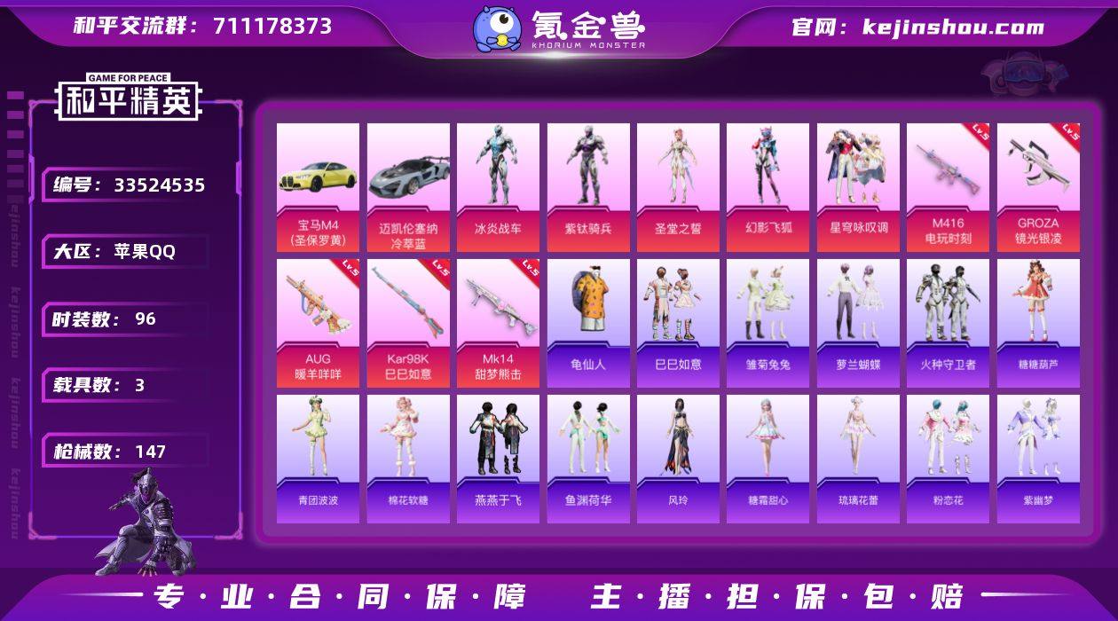 苹果 手Q-5粉装-5特效枪-3载具-1粉色飞行器-47804热力值-1王牌印记-96套装-147枪皮【热门品类】:套装-龟仙人【粉色套装】:角色-冰炎战车,角色-紫钛骑兵,角色-圣堂之誓,粉装-幻影飞狐,粉装-星穹咏叹调【粉色枪皮等级】:M416-电玩时刻(五级),GROZA-镜光银凌(五级),AUG-暖羊咩咩(五级),Kar98K-巳巳如意(五级),Mk14-甜梦熊击(五级)【粉色载具】:宝马M4(圣保罗黄),迈凯伦塞纳(冷萃蓝)【粉色枪皮】:M416-电玩时刻,GROZA-镜光银凌,AUG-暖羊咩咩,Kar98K-巳巳如意,Mk14-甜梦熊击【粉色飞行器】:翎光蝶翼飞行器【粉色降落伞】:变形金刚降落伞,熔岩统帅降落伞,圣堂之誓降落伞,精灵梦叶罗丽降落伞,金丰海韵降落伞,时空协奏降落伞,鬼刀降落伞,翎光蝶翼降落伞,智耀战神降落伞,星穹咏叹调降落伞,异瞳寒姬降落伞【稀有套装】:套装-龟仙人,套装-巳巳如意,套装-雏菊兔兔,套装-萝兰蝴蝶,套装-火种守卫者,套装-糖糖葫芦,套装-青团波波,套装-棉花软糖,套装-燕燕于飞,套装-鱼渊荷华,角色-风玲,角色-糖霜甜心,角色-琉璃花蕾,套装-粉恋花,套装-紫幽梦,套装-蓝冰羽,角色-猎影月神,套装-星影赞美诗,套装-星渊小夜曲,套装-蜜露汐语【稀有枪皮】:A...