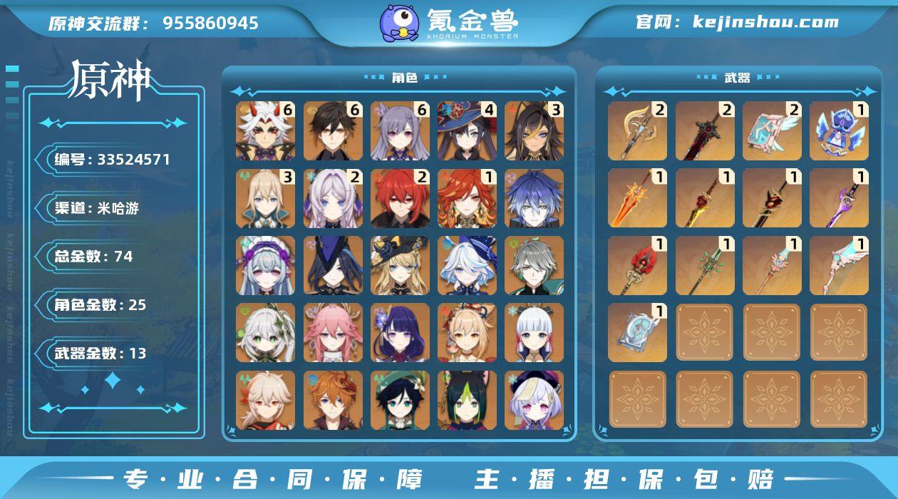 60级/74黄/男主/25个五星角色/13个五星武器/满命钟离/二命茜特菈莉/雷电将军/一命玛薇卡/满命荒泷一斗/娜维娅/枫原万叶/温迪/神里绫华/菲林斯/八重神子/满命刻晴/艾尔海森/纳西妲/提纳里/芙宁娜/四命莫娜/宵宫/二命迪卢克/三命琴/达达利亚/克洛琳德/三命迪希雅/七七/梦见月瑞希/天空之翼/祭星者之望/四风原典/天空之卷/和璞鸢/天空之脊/护摩之杖/焚曜千阳/裁断/赤角石溃杵/狼的末路/有乐御簾切/雾切之回光